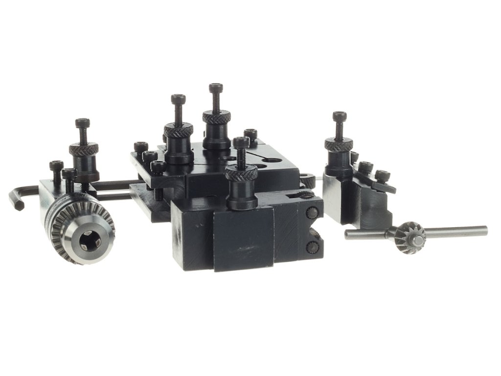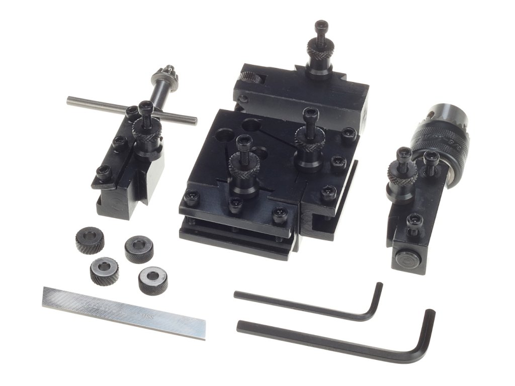 Der schnellspannende Kopf ist zur Befestigung an den Messersupport der Drehbank bestimmt. Die einzelnen Adapter werden an den Kopf mit einer exzentrischen Arretierung in einer Schwalbenschwanznut gespannt. De Satz beinhaltet Adapter: 2 St. für Vierkantenmesser, 1 St. für ein Spannfutter oder rundes Messer, 1 St. für ein Abstechmesser und 1 St. Adapter mit Rändelrädern. Jeder Adapter hat einen separaten höhenverstellbaren Anschlag für eine optimale Einstellung des Werkzeuges. Somit ist eine maximale Zeitersparnis beim Werkzeugwechsel und -einstellung ermöglicht.