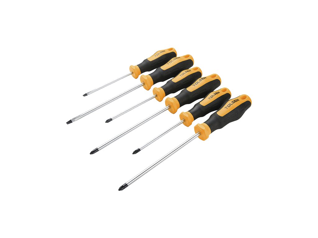 Set aus magnetischen Schraubendrehern aus CrV-Stahl mit ergonomischem Griff. Im Set enthalten: Schlitzschraubendreher 5,5 × 100; 6,5 × 150; Kreuzschraubendreher PZ1 × 100; PZ2 × 150; PH1 × 100 mm. PH2 × 150 mm.