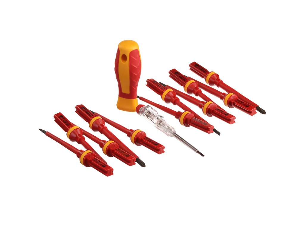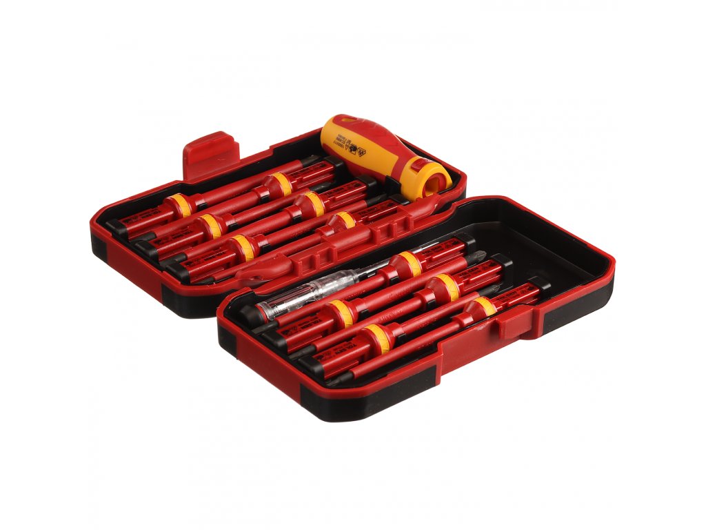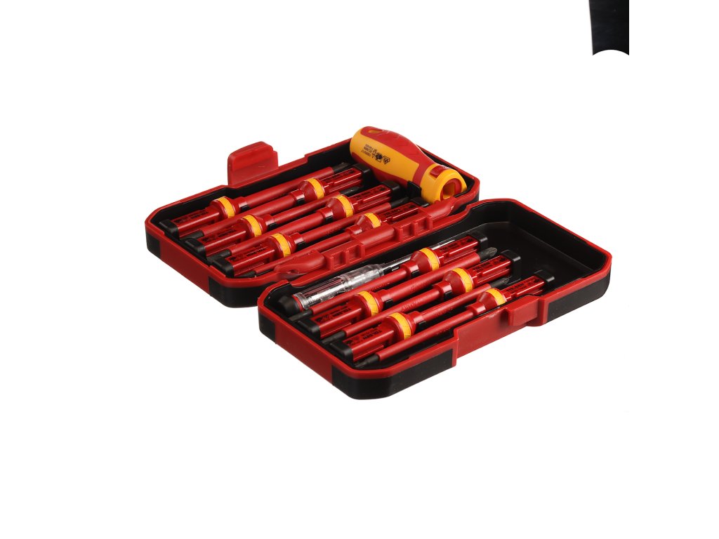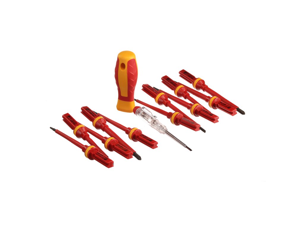 Schraubendreherset mit auswechselbarem Griff für vielseitigen Einsatz in der Elektronik. Automatische Verriegelung des Griffes, die das Herausziehen des Aufsatzes verhindert. Im Set enthalten: 4 St. Schlitzschraubendreher: 1,2 × 6,5 × 100 mm, 1 × 5,5 × 100 mm, 0,8 × 4 × 100 mm und 0,5 × 3 × 100 mm; 2 St. Kreuzschraubendreher: PH2 × 100 mm, PH1 × 80 mm; 2 St. Kreuzschraubendreher: PZ2 × 100 mm, PZ1 × 80 mm; 3 St. Torx: T20 × 100 mm, T15 × 100 mm, T10 × 100 mm; 1 St. Spannungsprüfer und 1 St. Griff. In einem Kunststoffkoffer geliefert.