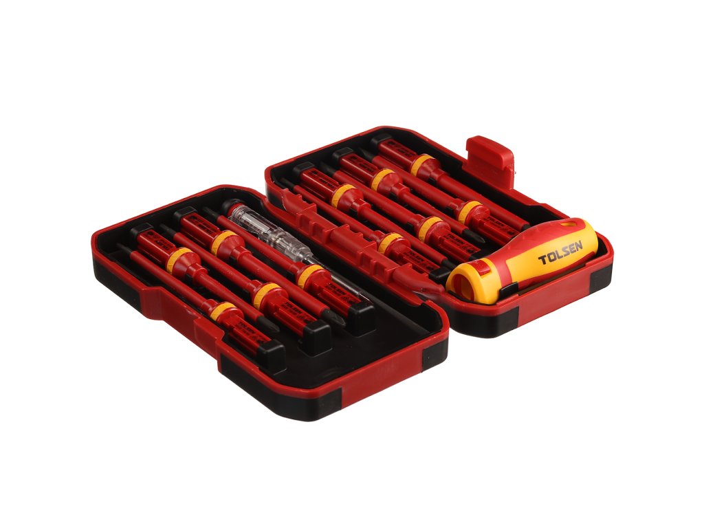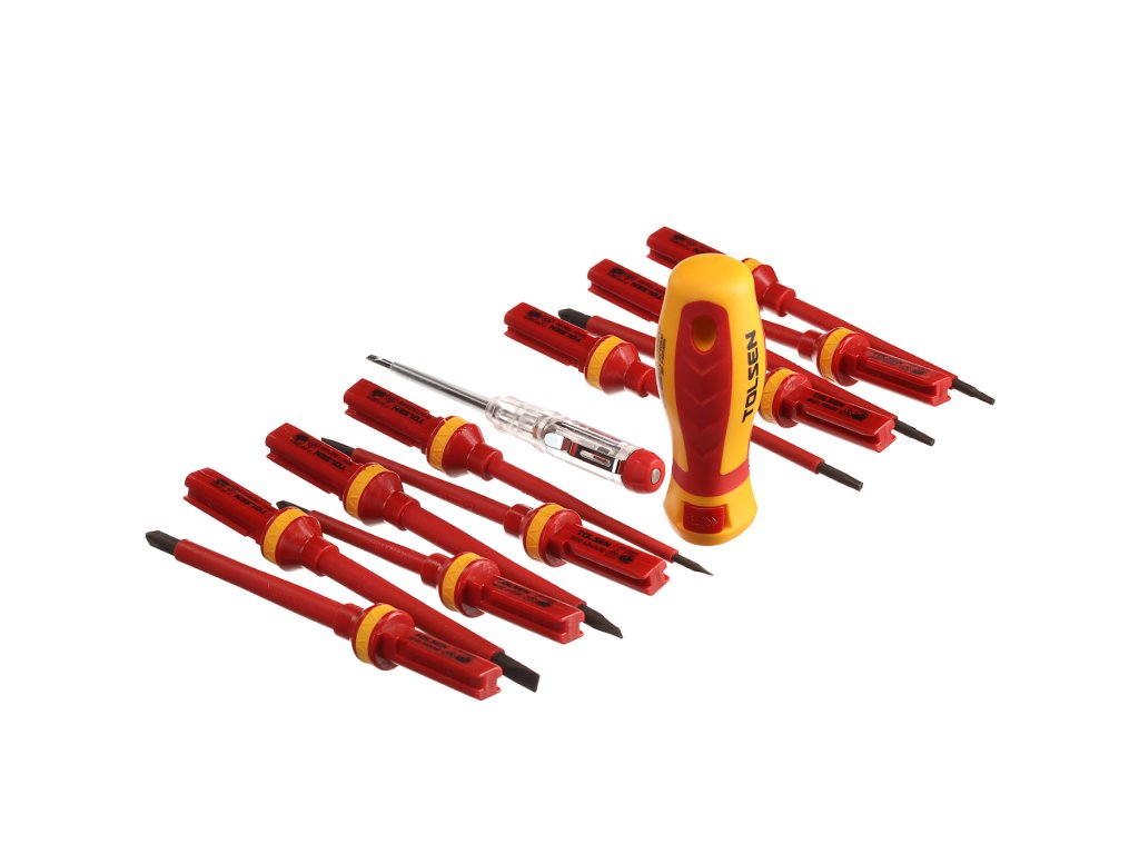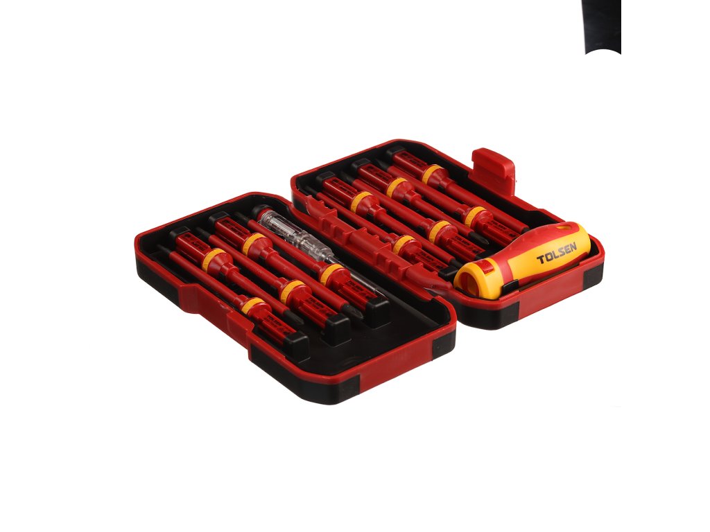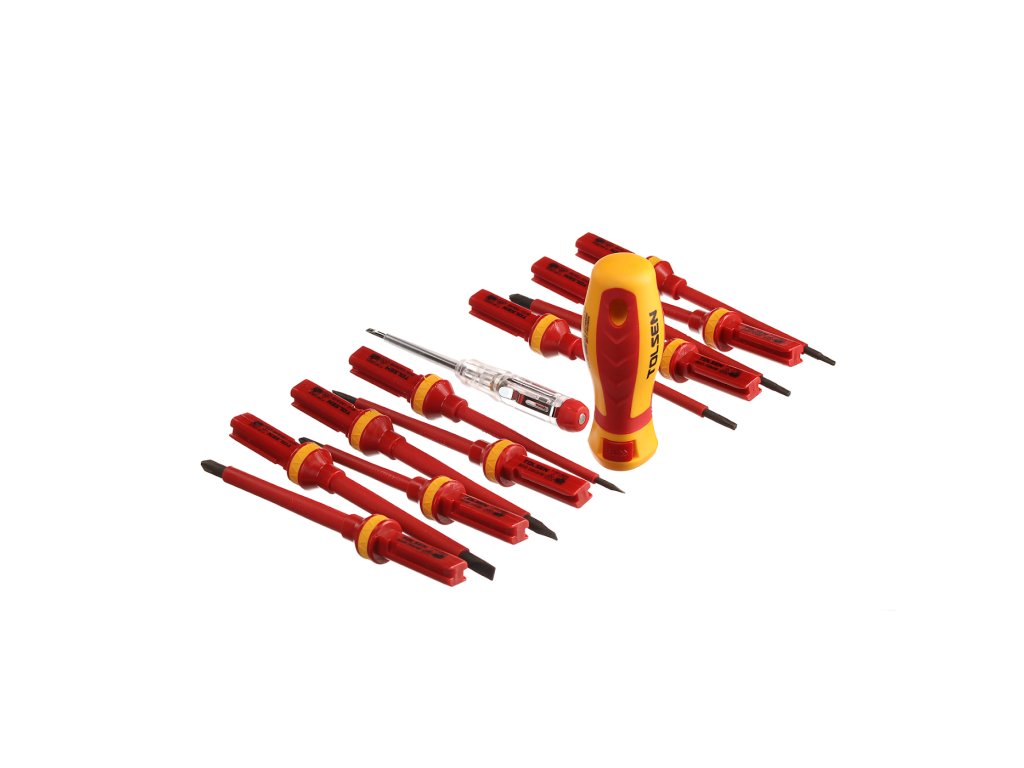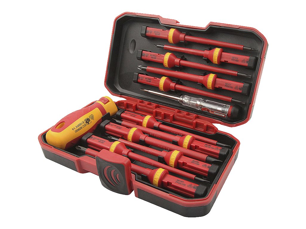 Schraubendreherset mit auswechselbarem Griff für vielseitigen Einsatz in der Elektronik. Automatische Verriegelung des Griffes, die das Herausziehen des Aufsatzes verhindert. Im Set enthalten: 4 St. Schlitzschraubendreher: 1,2 × 6,5 × 100 mm, 1 × 5,5 × 100 mm, 0,8 × 4 × 100 mm und 0,5 × 3 × 100 mm; 2 St. Kreuzschraubendreher: PH2 × 100 mm, PH1 × 80 mm; 2 St. Kreuzschraubendreher: PZ2 × 100 mm, PZ1 × 80 mm; 3 St. Torx: T20 × 100 mm, T15 × 100 mm, T10 × 100 mm; 1 St. Spannungsprüfer und 1 St. Griff. In einem Kunststoffkoffer geliefert.
