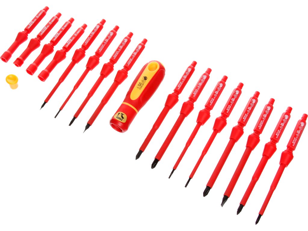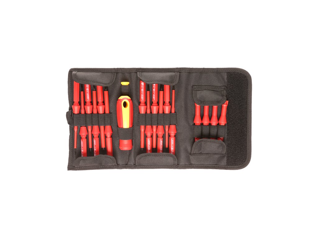 16 Typen von hochwertigen isolierten Werkzeugen aus CrV-Stahl und 2 Aufsteckgriffe. Übersichtlich in einer Nylonkassette aufbewahrt, Maße 130 × 215 × 50 mm.