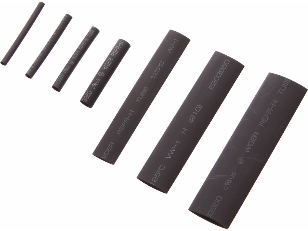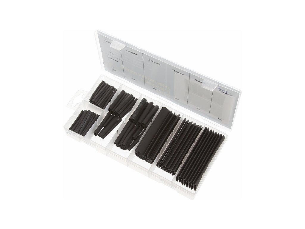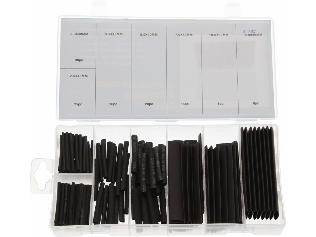 Schwarze Bougieröhre zum Warmschrumpfen, Maße 2 × 40 mm (30 Stk.); 2,5 × 40 mm (25 Stk.); 3,5 × 40 mm (20 Stk.); 5 × 40 mm (20 Stk.); 7 × 80 mm (16 Stk.); 10 × 80 mm (8 Stk.) und 13 × 85 mm (8 Stk.). Übersichtlich in einer Kunststoffkassette aufbewahrt.