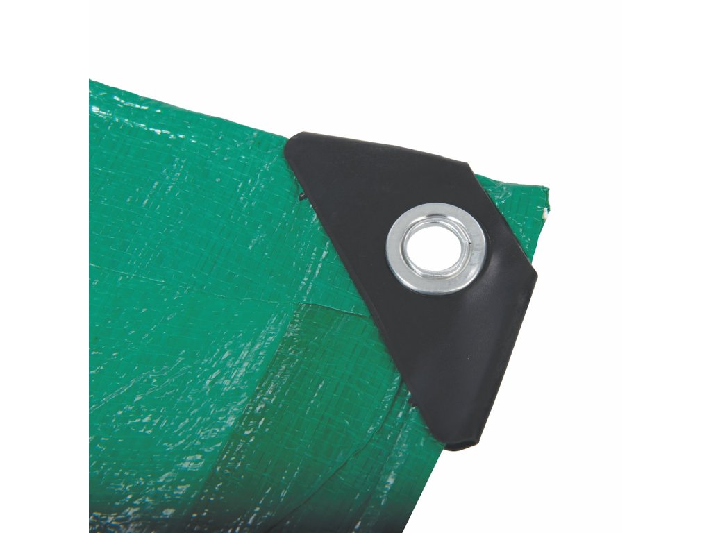 Polyethylen 140 g/m² verstärkt mit UV-Fasern mit starkem Seil, heißversiegelter Saum mit verstärkten Eckabdeckungen. Reißfest, Wasser und Schimmel. Ösen aus rostfreiem Stahl im Abstand von 1 m. Für Schutzanwendungen wie Gebäude, Überdachungen und Verkaufsstände. Maximale Toleranzen von 50 – 100 mm für tatsächliche Abmessungen.