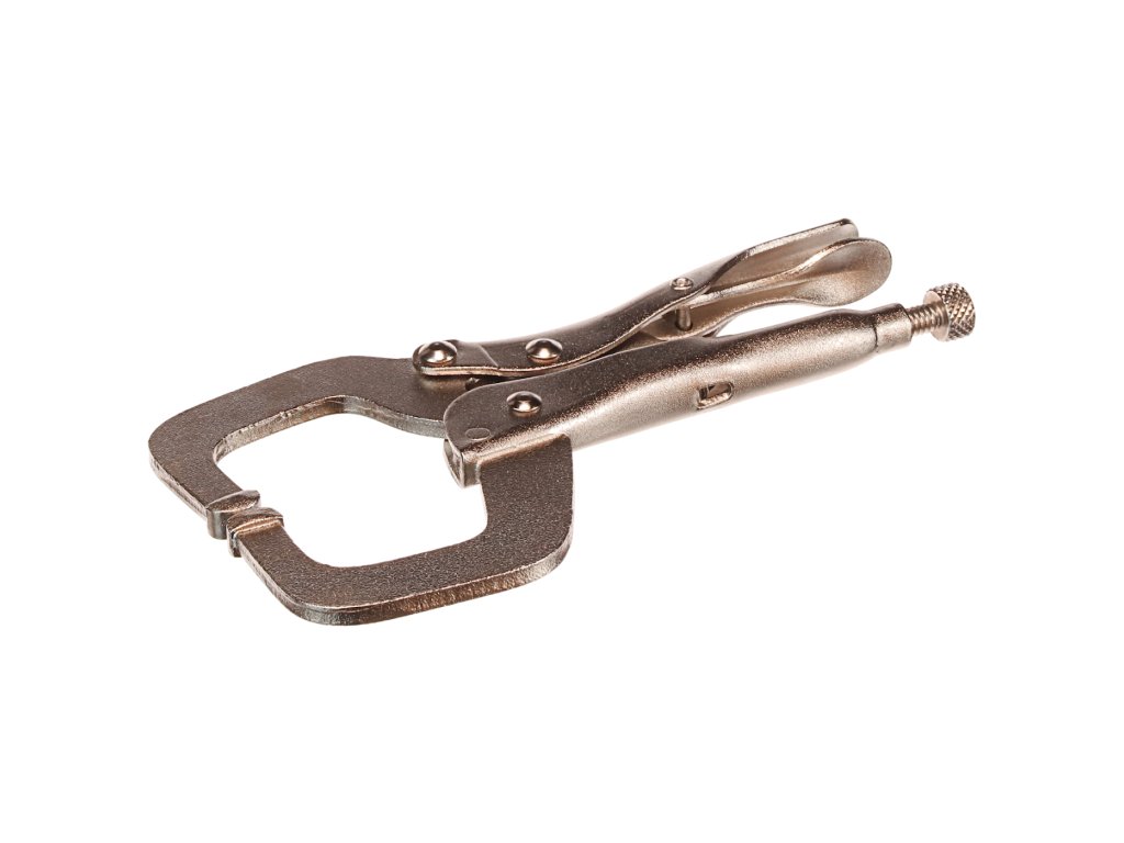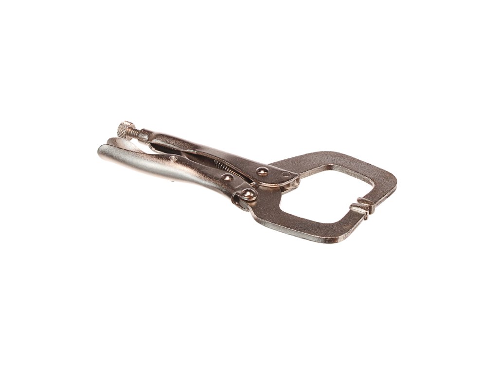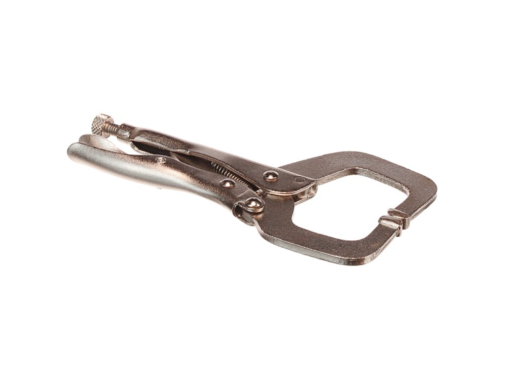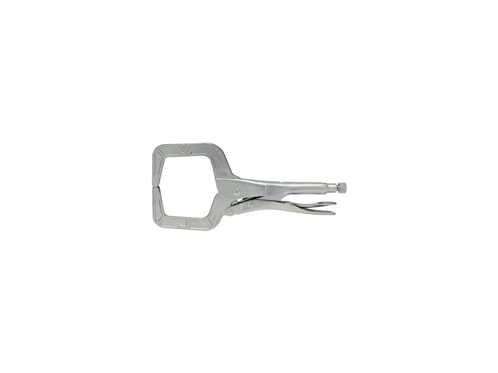 Praktische, selbstsichernde C-förmige Zange. Dient zum Einspannen vom Rundmaterial, vom profiliertem und flachen Material, z. B. beim Schweißen. Einhandbedienung, hoher Klemmdruck durch die Klemmhebelübersetzung. Einstellung mit Handschraube. Spannbereich: 0 – 40 mm. Abmessungen 170(185) x 88(115) x 15 mm. Material Stahl.
