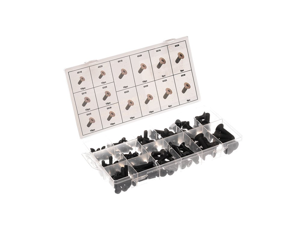 Im Set von geschwärzten Innensechskant-Senkschrauben enthalten: 10 St. M4 × 16; 10 St. M4 × 25; 10 St. M5 × 16; M5 × 20; 10 St. M5 × 25; 10 St. M5 × 30; 10 St. M6 × 16; 10 St. M6 × 20; 10 St. M6 × 25; 10 St. M6 × 30; 6 St. 8 ×16; 6 St. M8 × 20; M 8 × 25 und 6 St. 8 × 30 mm.