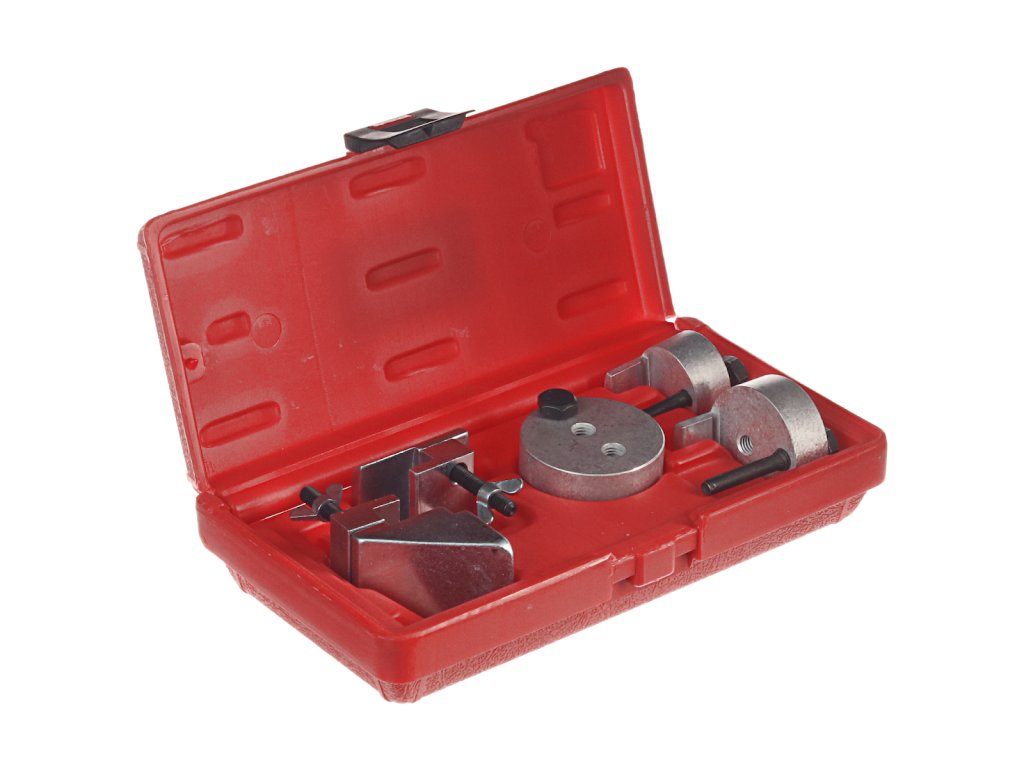 Das Montage- und Demontage-Set für Keilrippen- und Zahnriemen enthält 5 Vorrichtungen, die für folgende Kfz-Motoren geeignet sind: Alfa Romeo, BMW, Chrysler, Fiat, Ford, Mercedes, PSA, Seat, Škoda, Smart, Volvo, VW, Audi, Mazda, Lancia, Citroen usw. Das Set ist in einem Kunststoffkoffer verstaut.