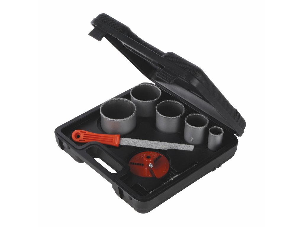 Es umfasst 33, 53, 67, 73 und 83 mm Hartmetall-Lochsägen, einen 8-mm-Pilotbohrer, einen Universaldorn und eine halbrunde Hartmetallfeile. Ideal zum Bohren in Wände oder Bodenfliesen.