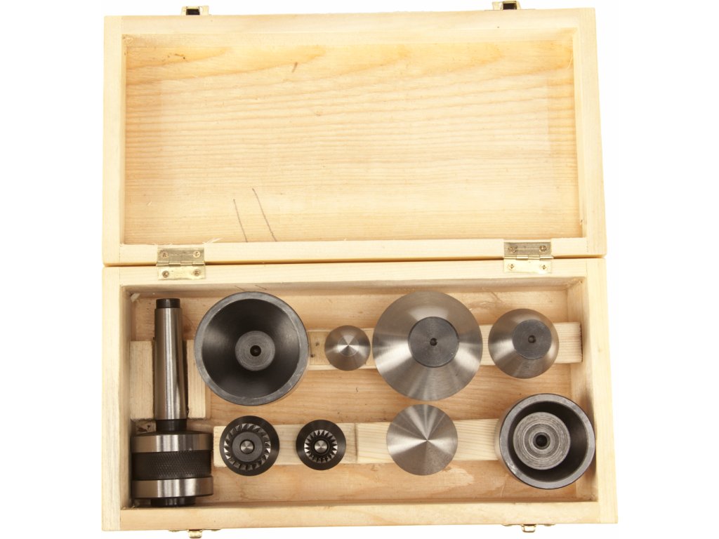 8 Dorne und drehbarer Spannaufsatz. Der Satz beinhaltet 2 Kegeldorne, 2 Dorne zur Innenaufnahme der Werkstücke, 2 Spanndorne für Hartholz und 2 Vorrichtungen zum Werkstückzentrieren mit gefedertem Dorn, alles in Mk2-Ausführung. Spannaufsatz 2 × Mk2 - 1 St.