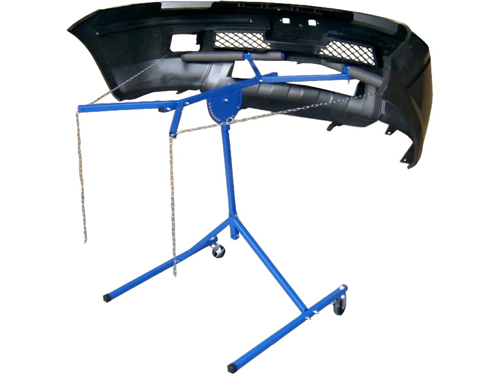 Mobiler Ständer zur Befestigung der Stoßstange oder des Frontschutzgitters beim Spachteln, Schleifen, bei der Bedeckung und beim Lackieren. Verstellbare Stützrollen mit weicher Auskleidung, Befestigung mit zwei Ketten mit Haken.