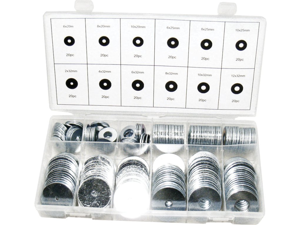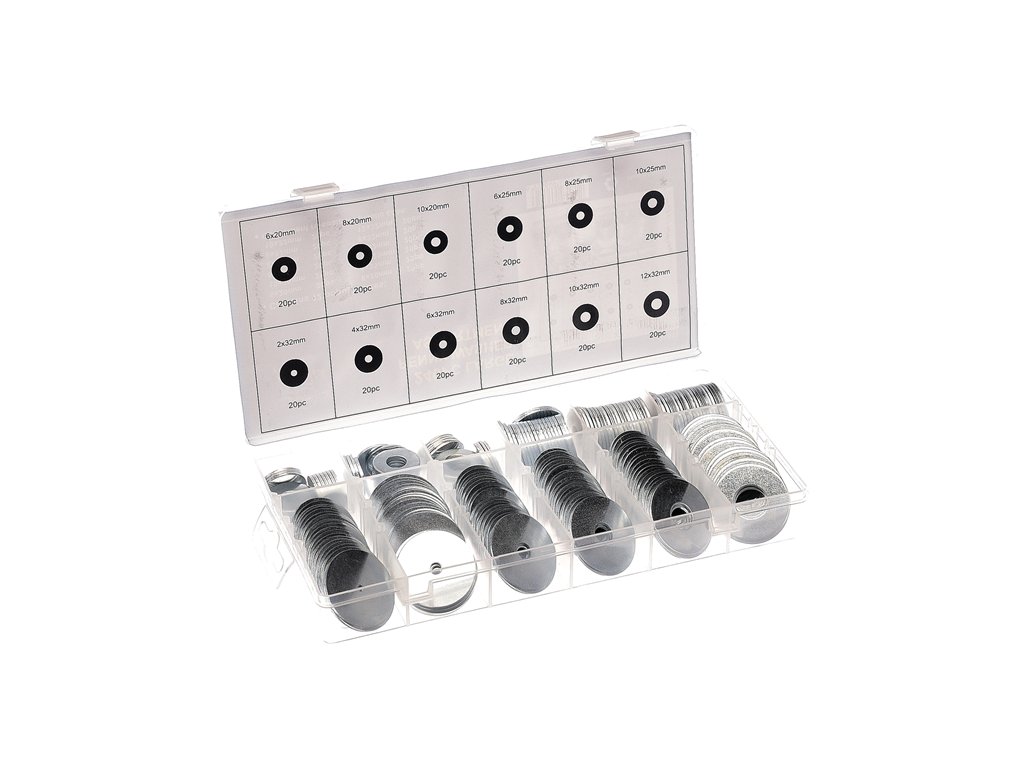 Im Set sind die nachfolgenden Unterlegscheiben enthalten: Ø 2 × 32; Ø 4 × 32; Ø 6 × 20; Ø 6 × 25; 6 × 32; Ø 8 × 20; Ø 8 × 25; Ø 8 × 32; Ø 10 × 20; Ø 10 × 25; Ø 10 × 32 a Ø 12 × 32 mm. In einer Kunststoffbox geordnet, jeweils 20 Stück von jeder Größe.