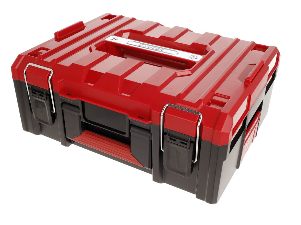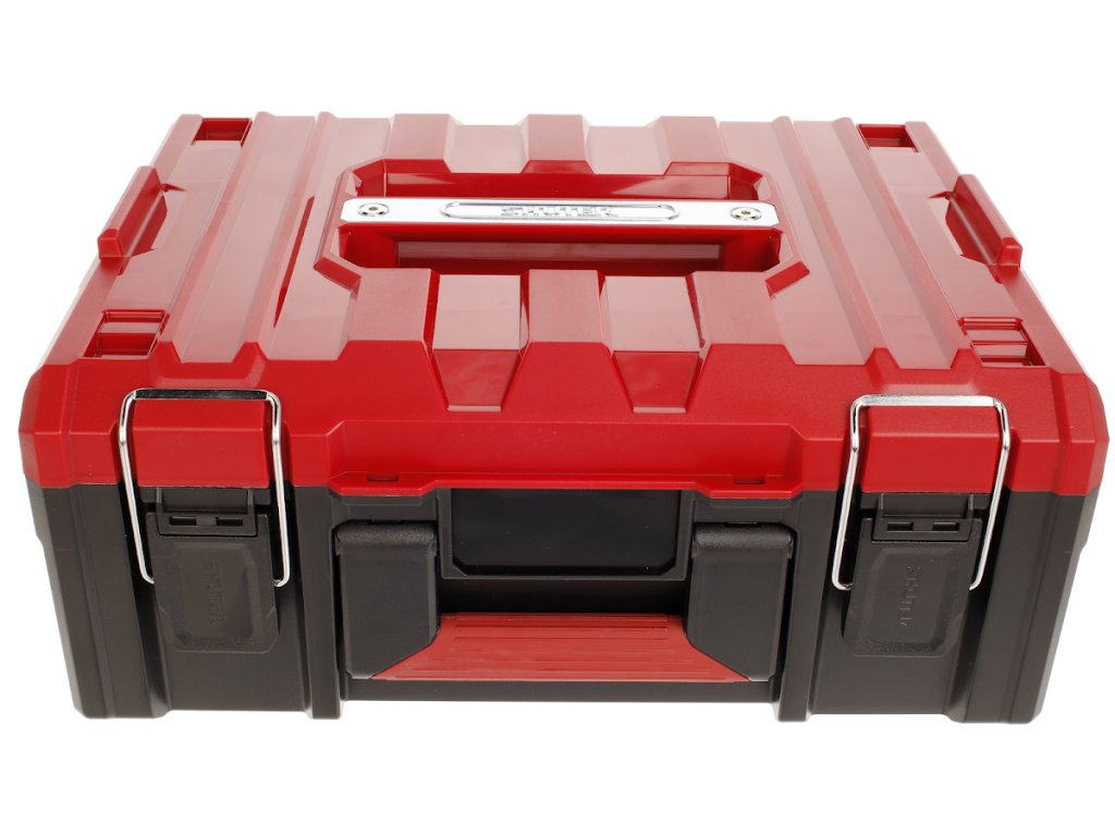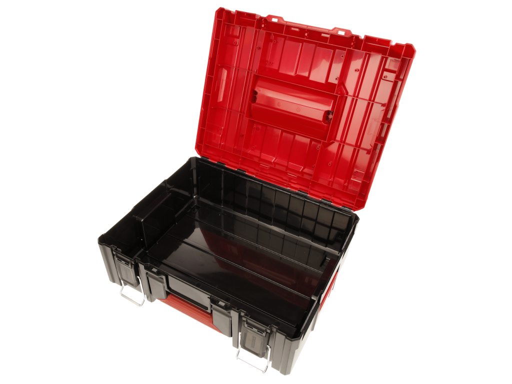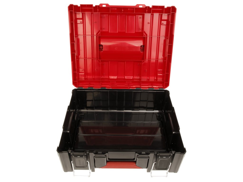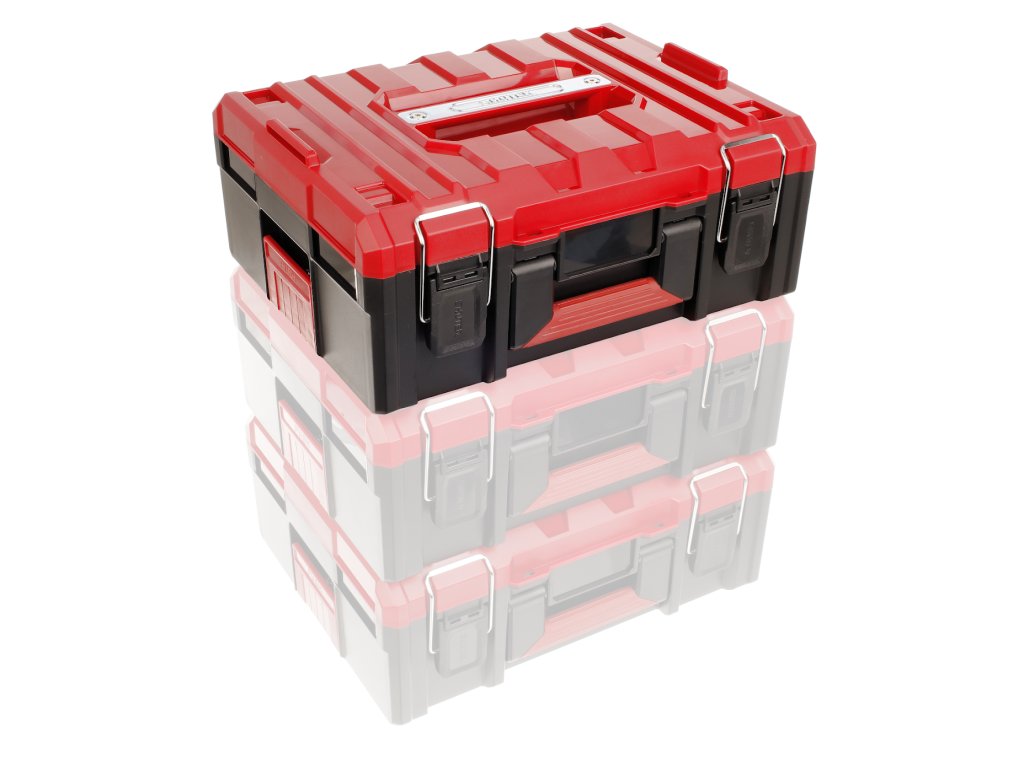 Hohe Tragfähigkeit von 30 kg, Kartons übereinander stapelbar, mit seitlichen Metallverriegelungen gesichert, versenkter TPE-Griff für einfaches und bequemes Heben, hohe Steifigkeit der schlagfesten ABS-Konstruktion, Abmessungen (B)420 × (T)350 × (H)184 mm. Lieferung ohne Einlegeböden und Fächer.