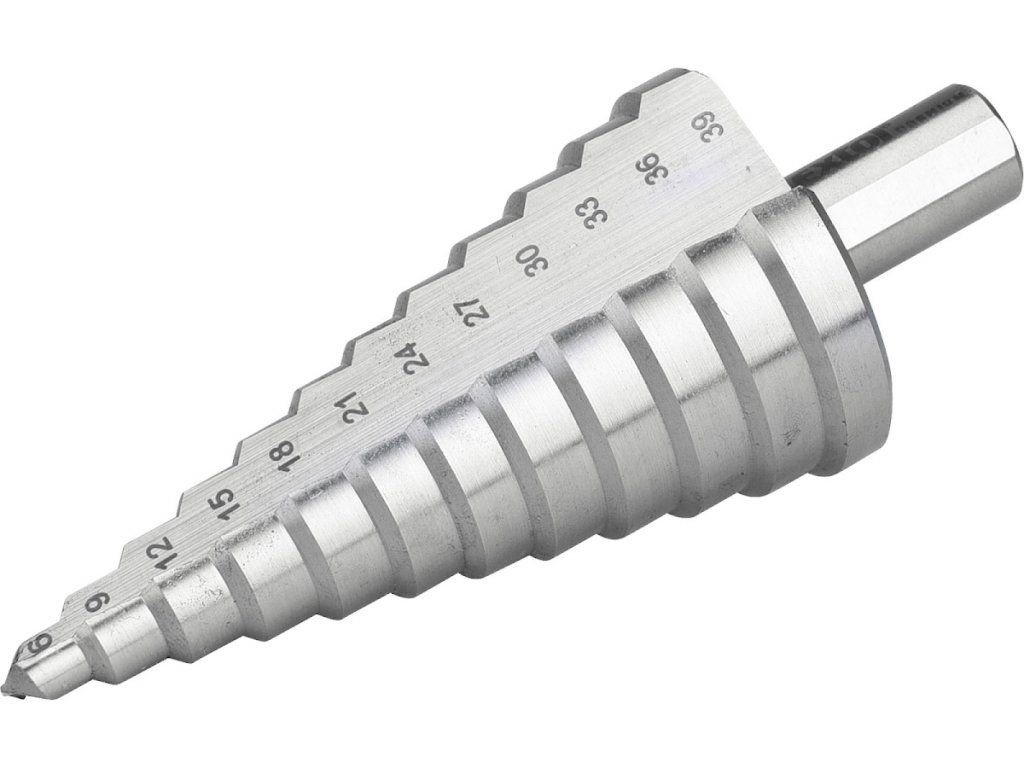 Stufenbohrer werden zum Bohren von Rundlöchern in Platten, Rohren und Profilen aus legiertem und unlegiertem Stahl bis zu einer Wandstärke von 4 mm zum Bohren und Entgraten in einem Arbeitsgang eingesetzt. Sie können auch zum Bohren in weicheren Materialien wie Holz, Kunststoff und Plexiglas verwendet werden. Der Kegelbohrer ist für glattes, spitzenloses Bohren und Bohren ohne Verformung des Blechs ausgelegt. Bohrer können nachgeschärft werden.