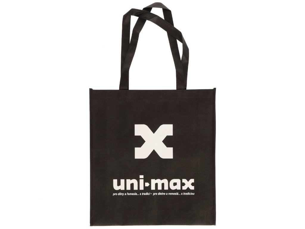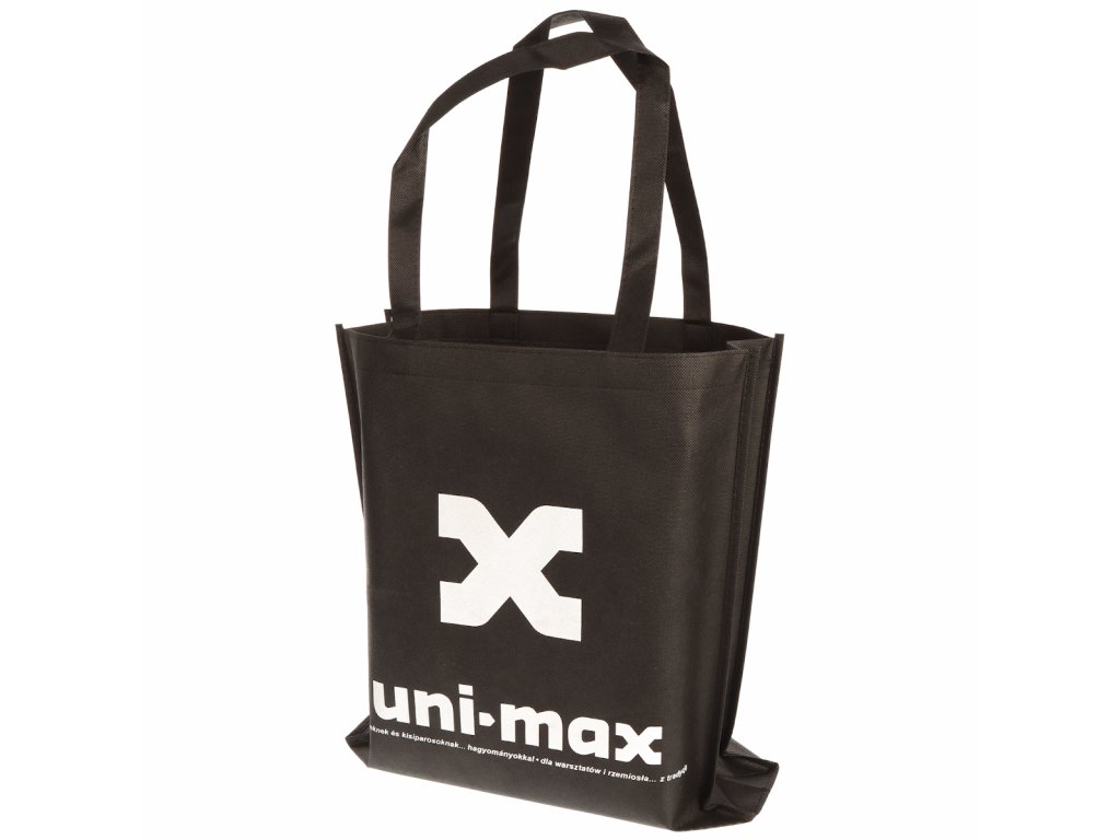 Die feste Tasche mit dem Logo besteht aus schwarzem Vliesstoff, Maße 400 × 370 × 100 mm, auch zum Tragen über der Schulter geeignet.