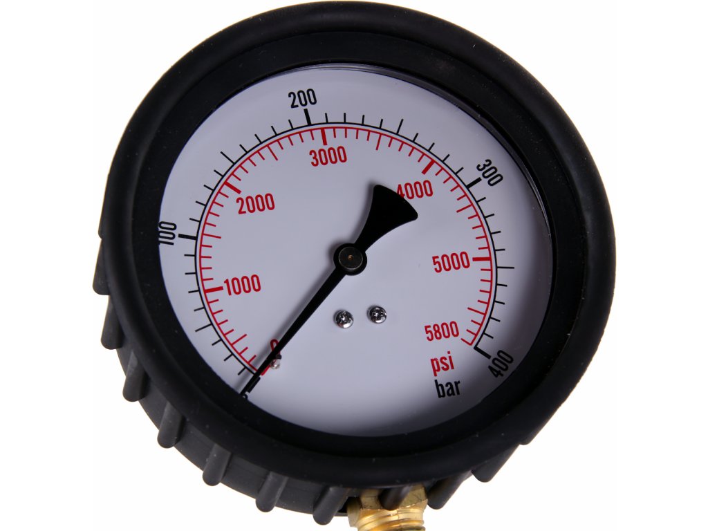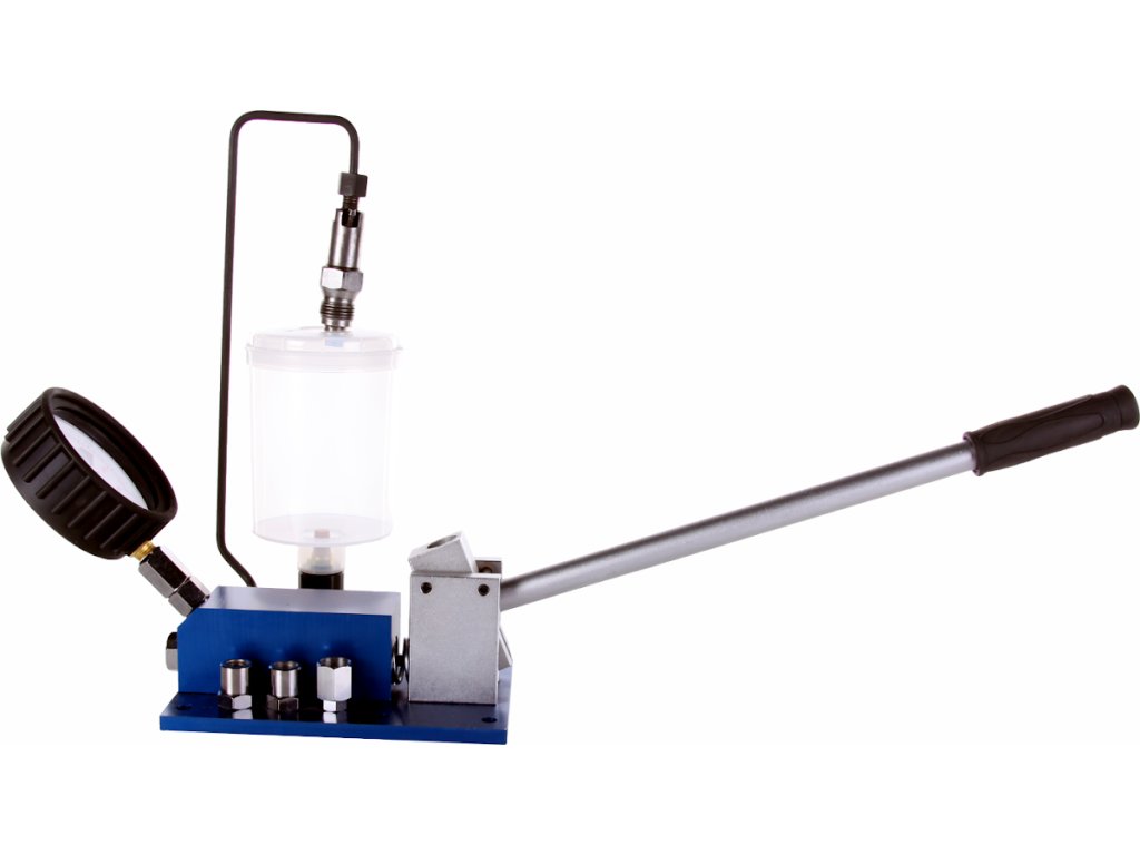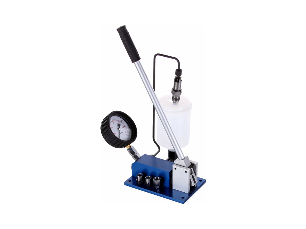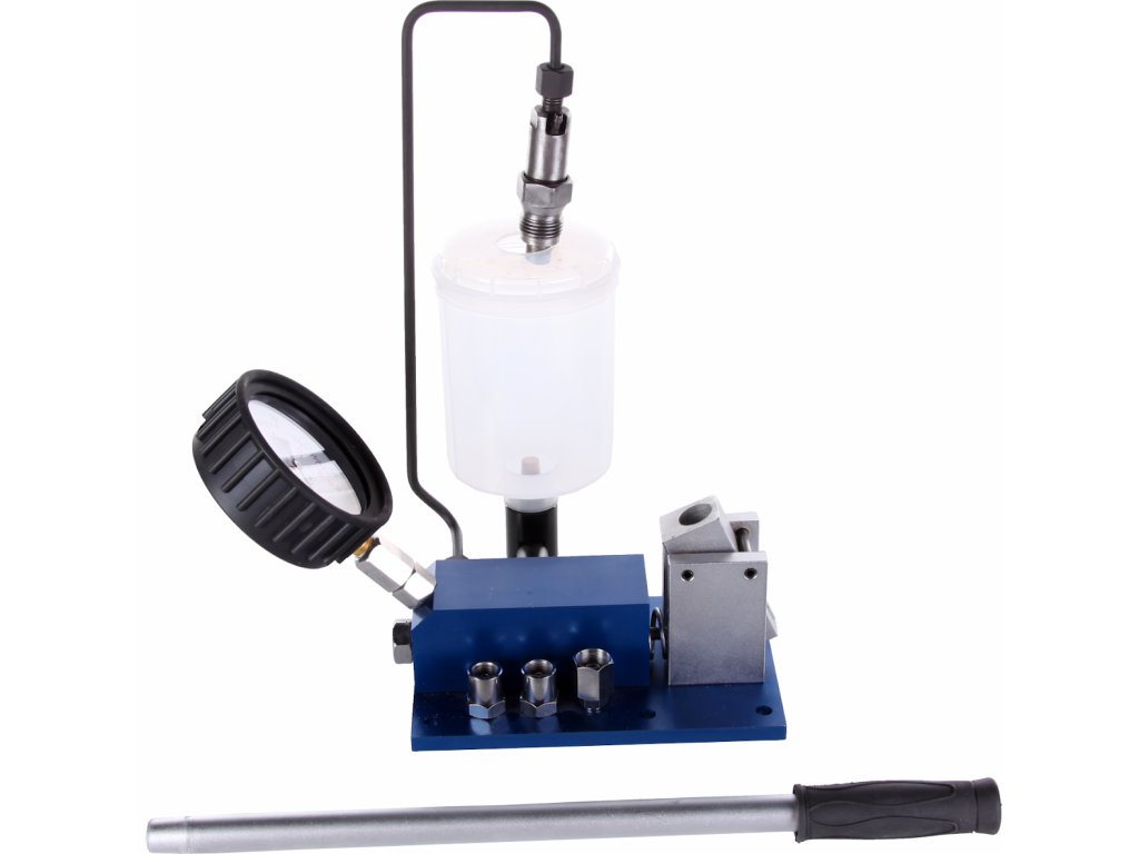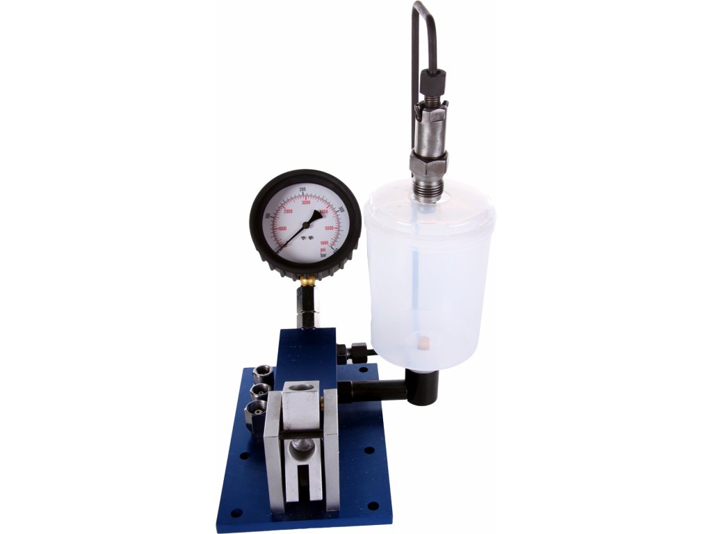 Tischgerät zur Dichtheitskontrolle der Kraftstoffeinspritzdüsen bei Fahrzeugmotoren. Alu-Ausführung mit Kunststoffbehälter zum Speichern und Sammeln der Testflüssigkeit. Der Tester ist mit manueller Druckpumpe und Druckmesser mit Schutzabdeckung aus Gummi. Druckrohrleitung mit Gewinde M12 × 1,5 mit Adapter M14 × 1,5; M12 × 1,25 und M17 × 0,75. Arbeitsdruck 0 – 400 bar (0 – 5 800 psi).