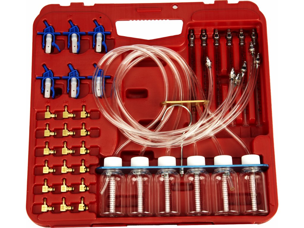 Der Satz ist zur Kraftstoffdurchflussmessung beim Einspritzsystem der Dieselmotore mit Einspritzungen Common Rail bis max. sechs Zylindern bestimmt. Einfache und schnelle Entdeckung der Verstopfung, des Verschleißes oder einer anderen Abweichung von der ordnungsgemäßen Funktion. Der Kunststoffkoffer beinhaltet Meßzylindern und Behälter und Adaptersortiment zum Anschluss an Systeme Bosch, Delphi und Denso zur optimalen Versorgung des Fahrzeugsortiments.