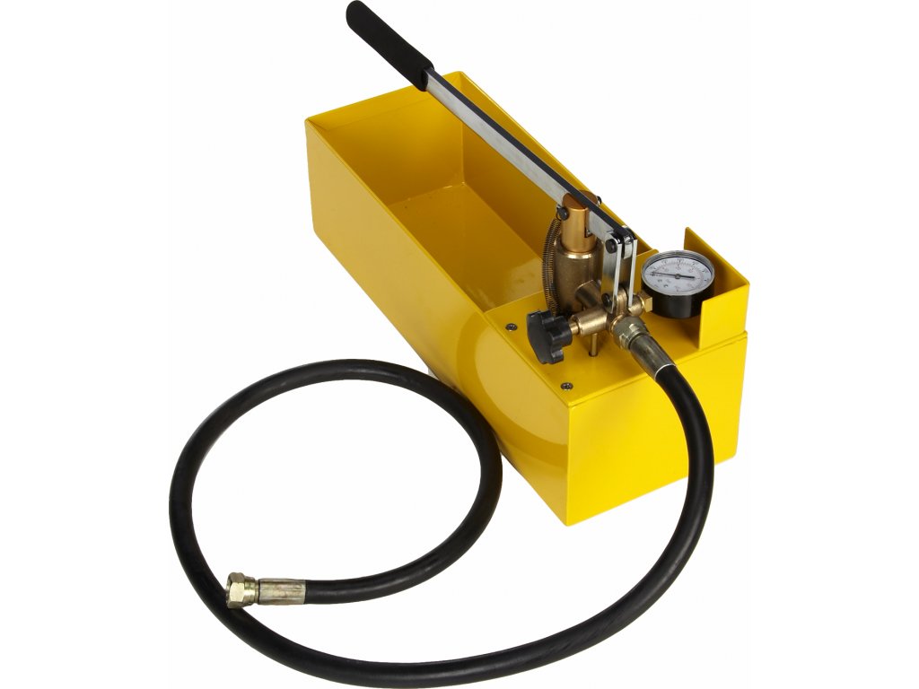 Für eine schnelle operative Druckprüfung der Dichtheit von den Rohrleitungssystemen und Tanks im Bereich der Wasserverteilungen, Heizungen, Solarsystemen, Kessel- und Druckbehälterbau. System mit einem Ventil, Prüfdruck 5 Mpa, Lieferung 40 ml/Hub, Tankinhalt 12 l. Länge Anschlussschlauch 1 000 mm, Innengewinde 1/2". Behälter aus Stahlblech.