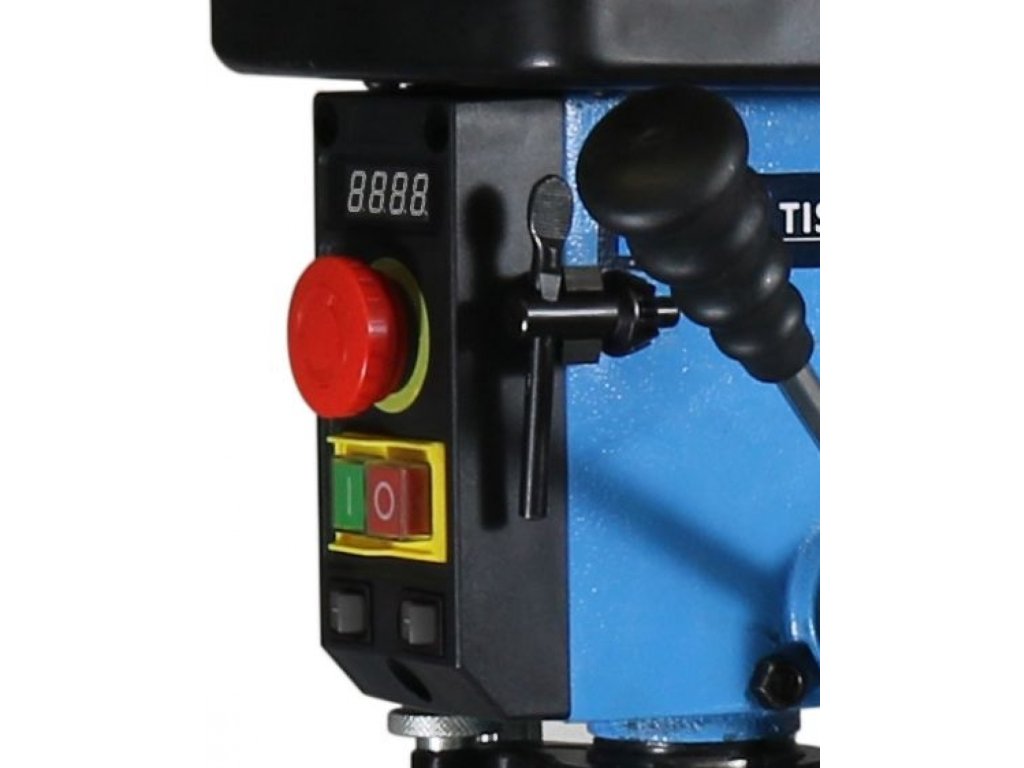 Variatorgetriebe (→ sanfte Änderung der Spindeldrehzahl; Bereich: 290 - 2.500 U / min; inkl. Anzeige auf Digitalanzeige), Laser-Zielstrahl, LED-Tischbeleuchtung.