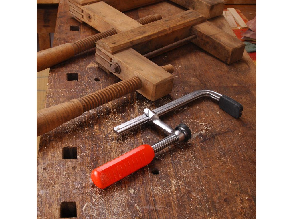 Tischlerklemme Typ „F″ - kompaktes massives Profil, Anlageflächen mit Kunststoff bedeckt, ergonomischer Kunststoffgriff.