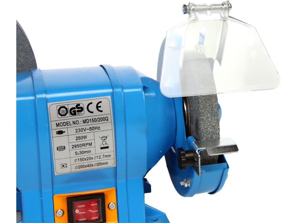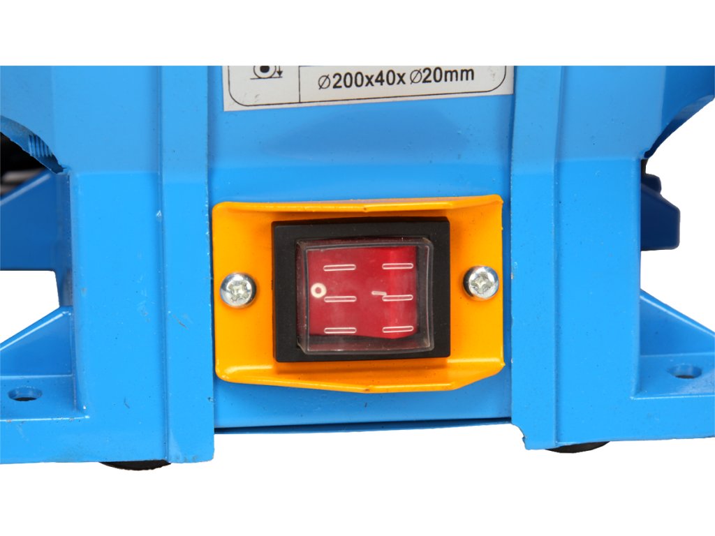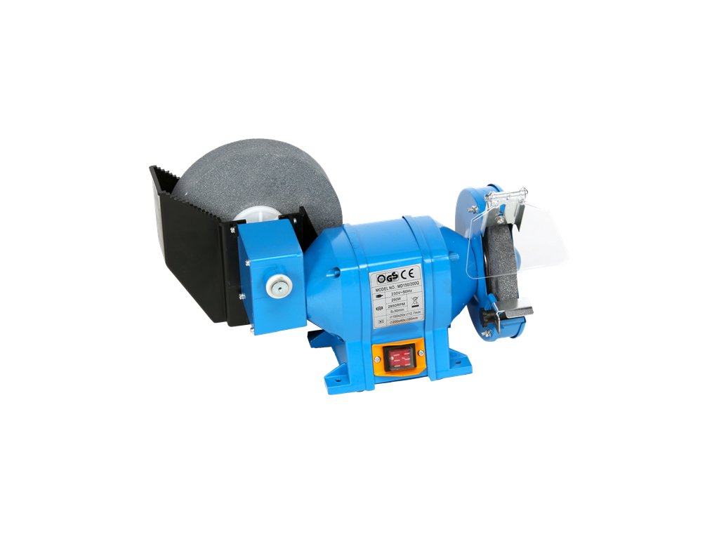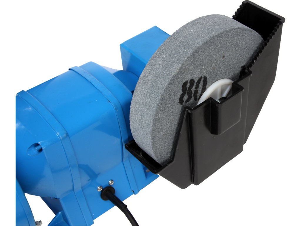 Zweischeiben-Schleifmaschine zum Trocken- und Nassschleifen. Die langsamlaufende Scheibe ist zum Schleifen von Schneidwerkzeugen wie Messer und Meißel geeignet. Scheibendurchmesser 200 × 40 × 20 mm und 150 × 20 × 12,7 mm; Drehzahl der langsamlaufenden Scheibe 134 U/min.; Scheibengrobheit P36 & P80.