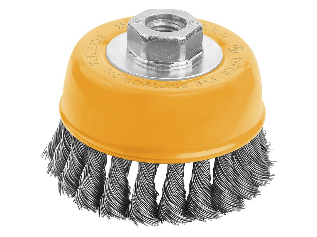 Ideal zum Entfernen von Rost und Farbe von Metalloberflächen. Drahtdurchmesser: 0,5 mm, Zopflänge 20 mm, Bürstendurchmesser 75 mm (Gehäusedurchmesser 65 mm), Bürstenhöhe 56 mm, Befestigungsmutter M14 x 2 mm, max. Drehzahl 12.500 U/Min.
