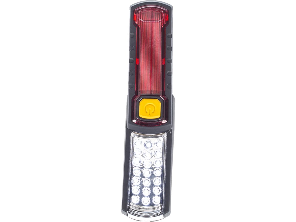 Drei Leuchtmodi: Dauerlicht, Blinklicht und mit rotem Filter, 3 LEDs (0,3 W), 21 LEDs (2 W), Magnethalter, Einspeisung 3 × AAA-Batterien, Maße 135 × 45 × 51 mm.