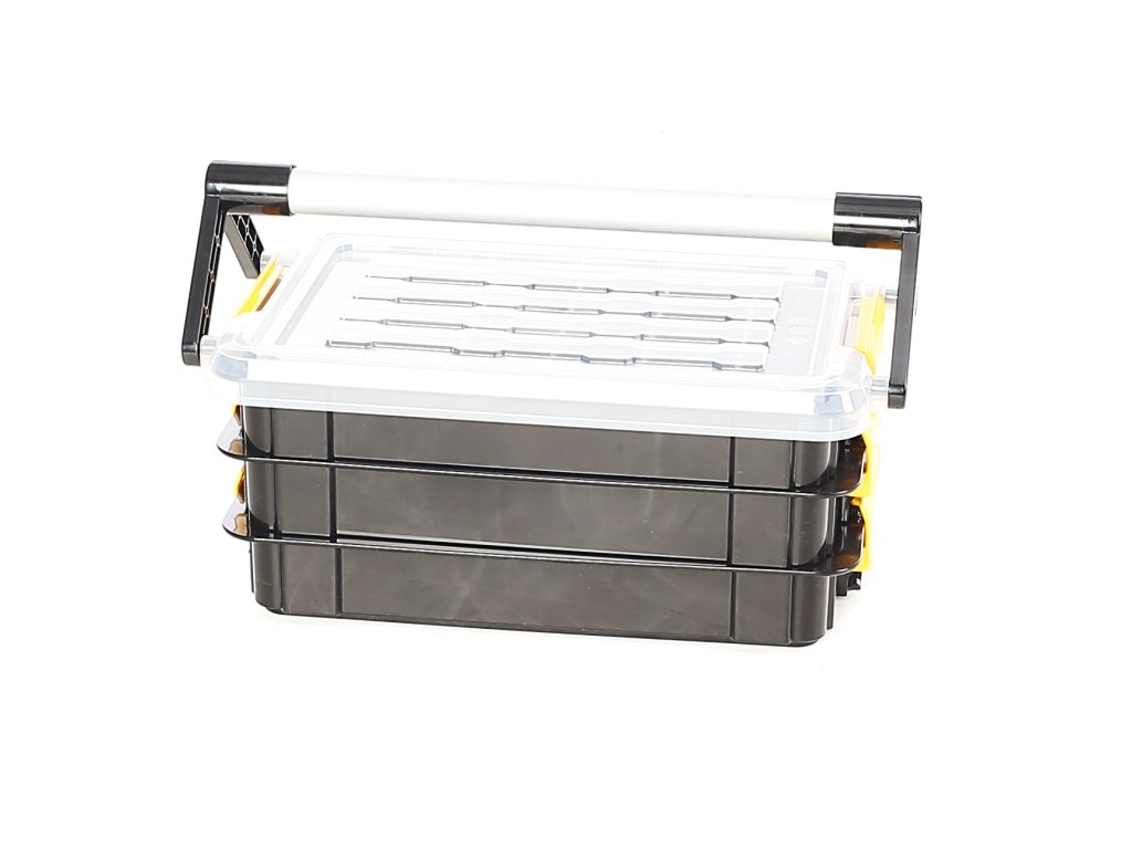Praktischer Organiser für Verbindungsmaterial, mit drei separaten Boxen mit den Abmessungen von 380× 260× 55 mm. 1 × Box ohne Fächer, 1 × Box, 6 herausnehmbare Fächer und 1 × Box, 18 feste Fächer. Kunststoffdeckel, transparent. Klappgriff.