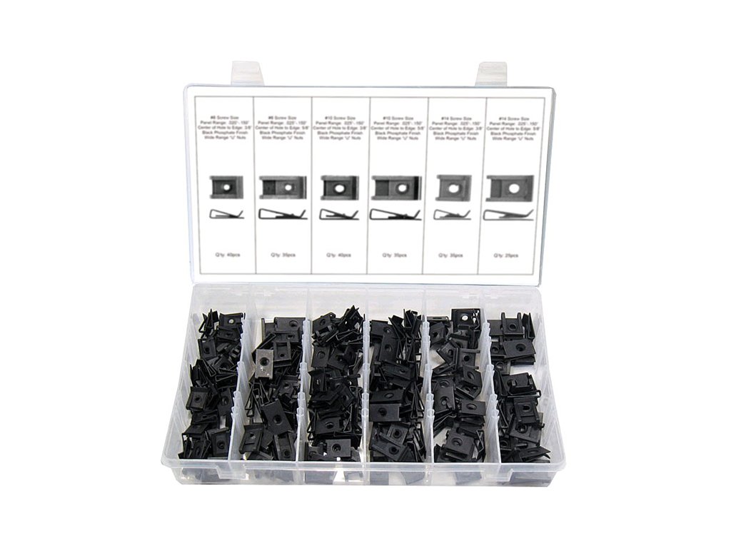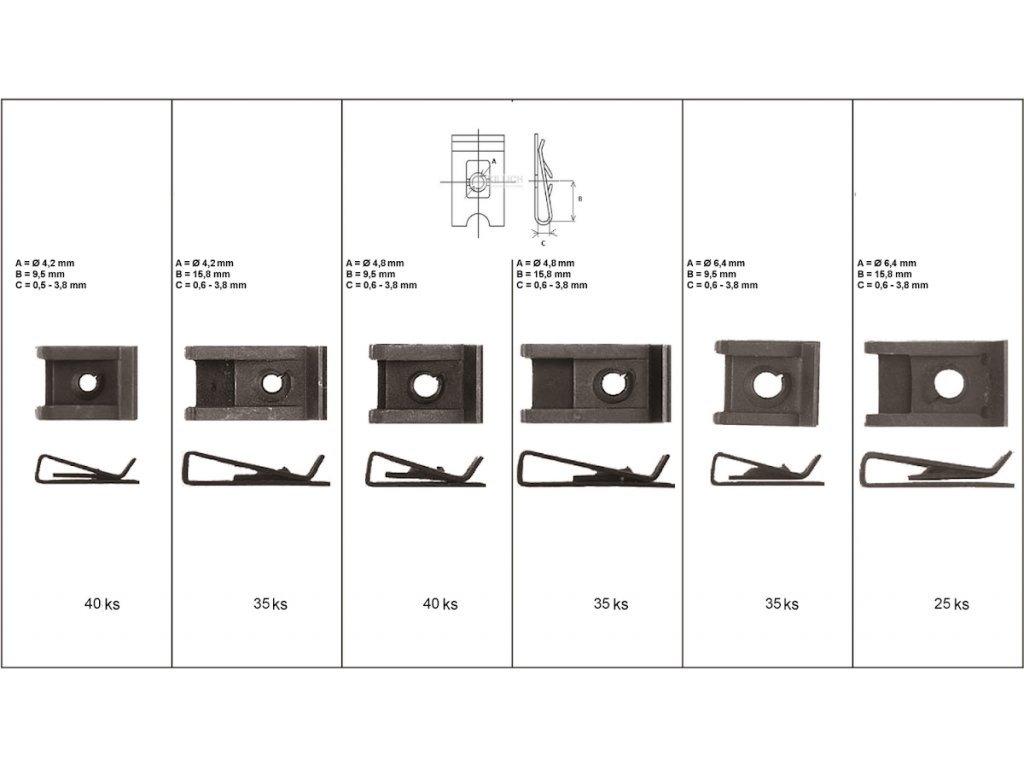 Das Set von für Fahrzeuge passenden Muttern enthält Folgendes: Muttern Ø 4,2 40 St.; für Blechstärken von 0,5 – 3,8 mm; Entfernung der Öffnung 9,5 mm. Muttern Ø 4,2 35 St.; Blech 0,65 – 3,8 mm; Öffnung 15,8 mm. Muttern Ø 4,8 40 St.; Blech 0,65 – 3,8 mm; Öffnung 9,5 mm. Muttern Ø 4,8 35 St.; Blech 0,65 – 3,8 mm; Öffnung 15,8 mm. Muttern Ø 6,4 35 St.; Blech 0,65 – 3,8 mm; Öffnung 9,5 mm und 25 St. Muttern Ø 6,4; Blech 0,65 – 3,8 mm; Öffnung 15,8 mm. In einer Kunststoffbox verstaut.