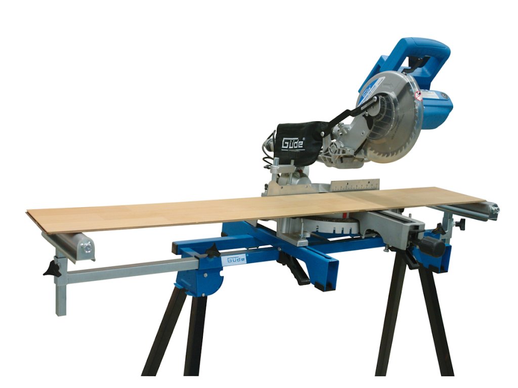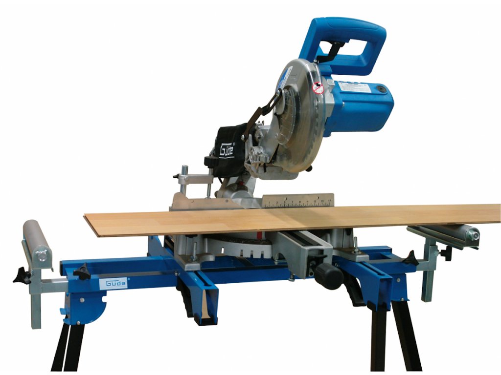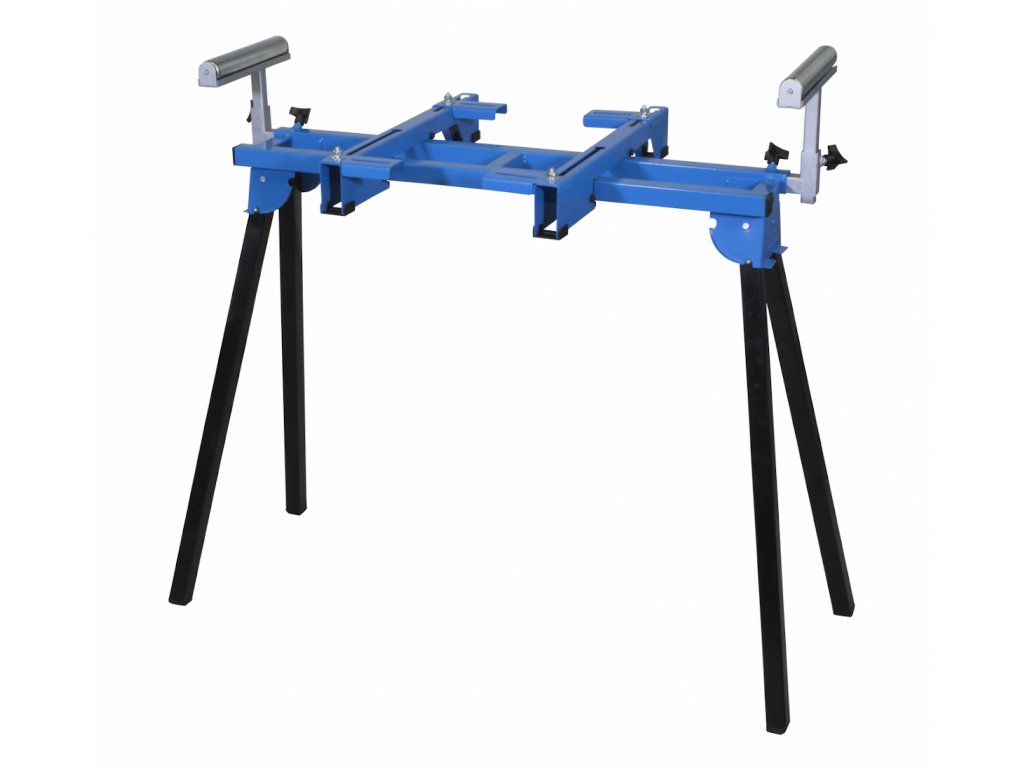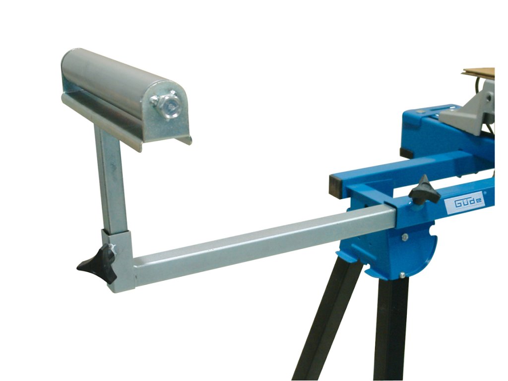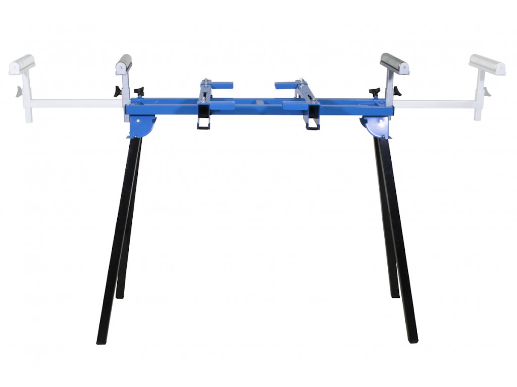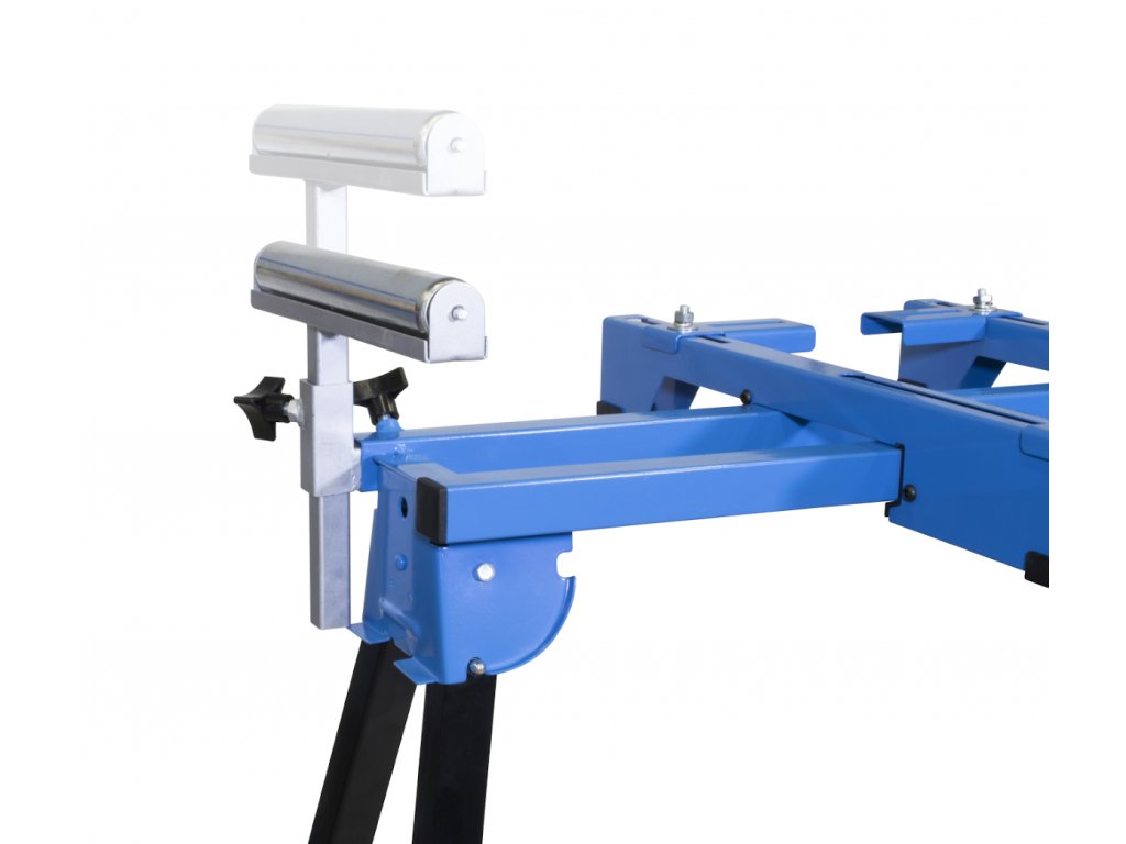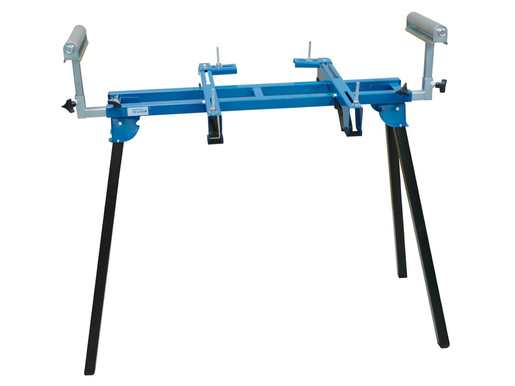 Stabiler Fixierständer zur sicheren Fixierung der Maschine (→ max. Aufspannmaß: 450 x 850 mm), positionierbare Vorschubrollen (→ max. Länge/Höhe Ausladung: 340/145 mm).