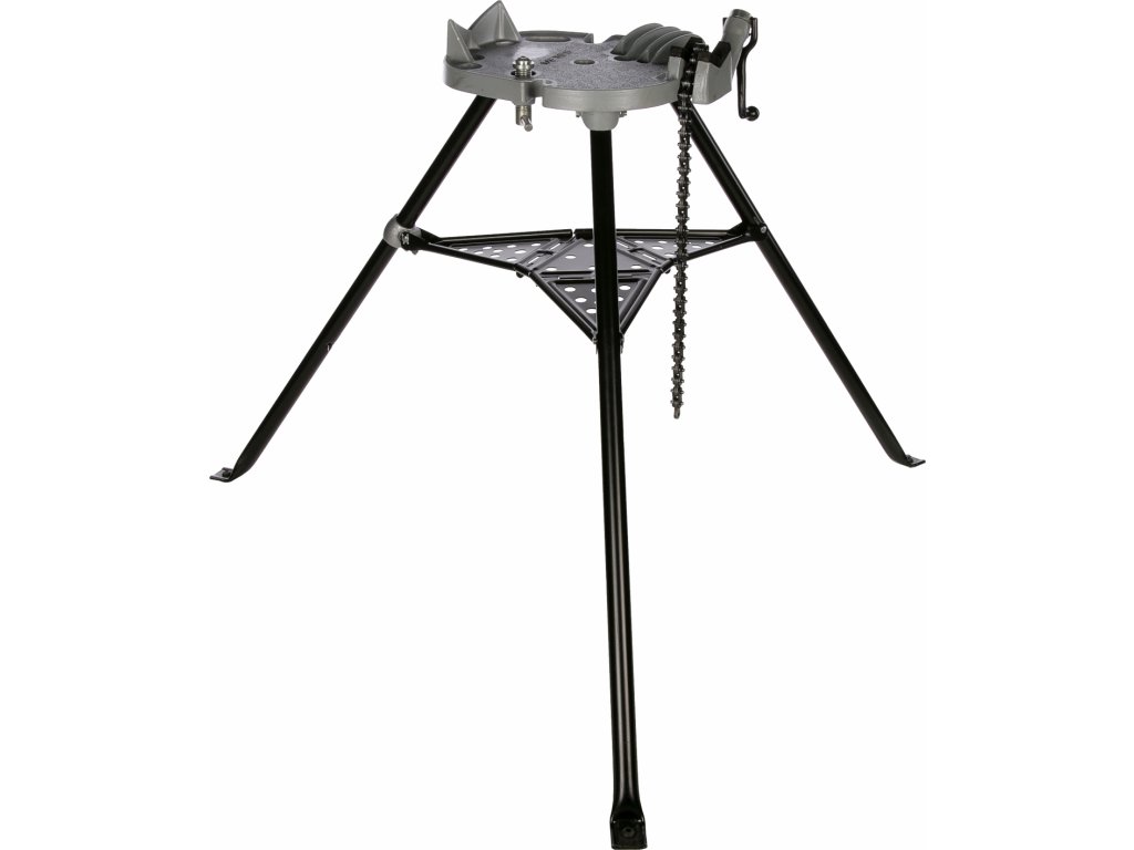 Ständer mit Schraubstock für Rohre. Neuartige Variante des bewährten Pioniers. Kippbarer Dreifuß mit Kettenspannen der Rohre 1/2" – 6". Die entlastete Platte ist mit Radien für Rohrbiegungen kleinerer Durchmesser ausgestattet.