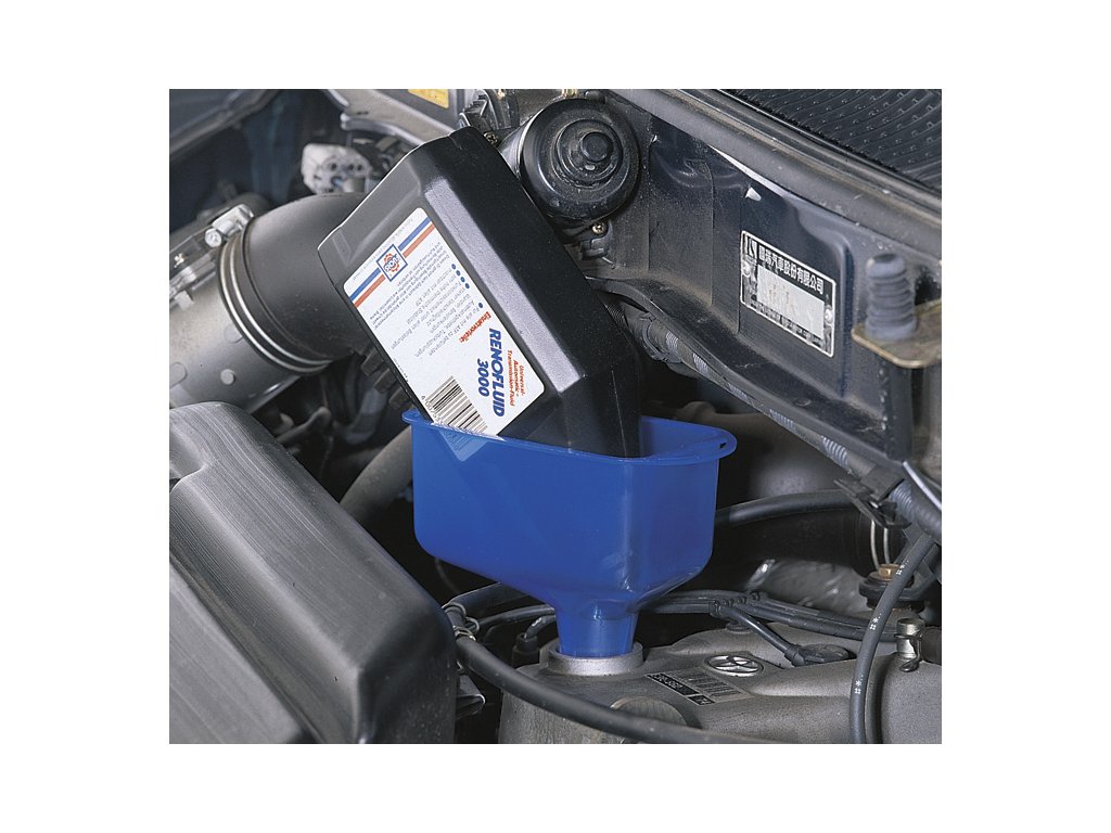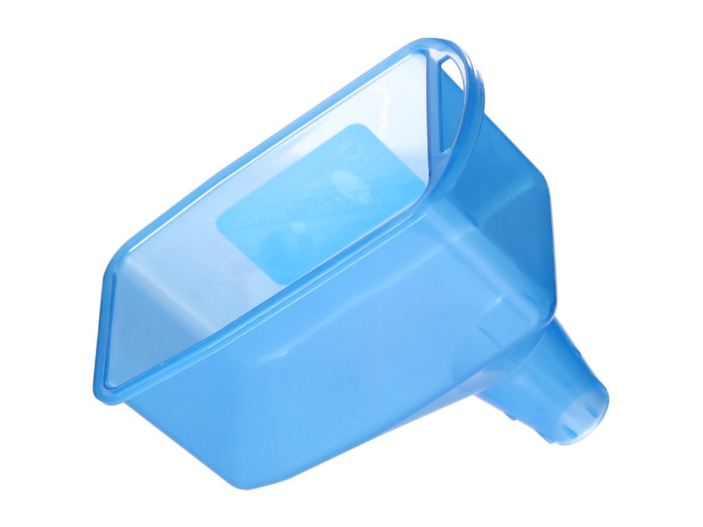 Trichter zum sauberen Nachfüllen und Wechsel von Motoröl. Geeignet insbesondere zum Befüllen aus vierkantigen Gebinden. Abmessungen 180 × 100 × 145 mm; Volumen von 0,85 l.
