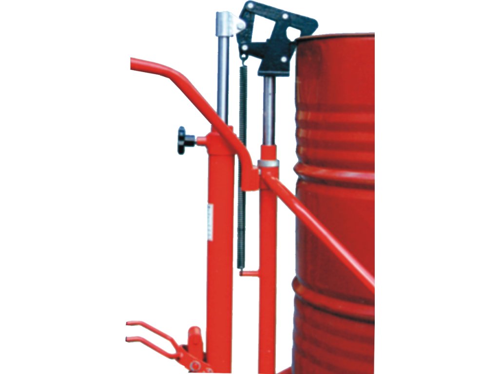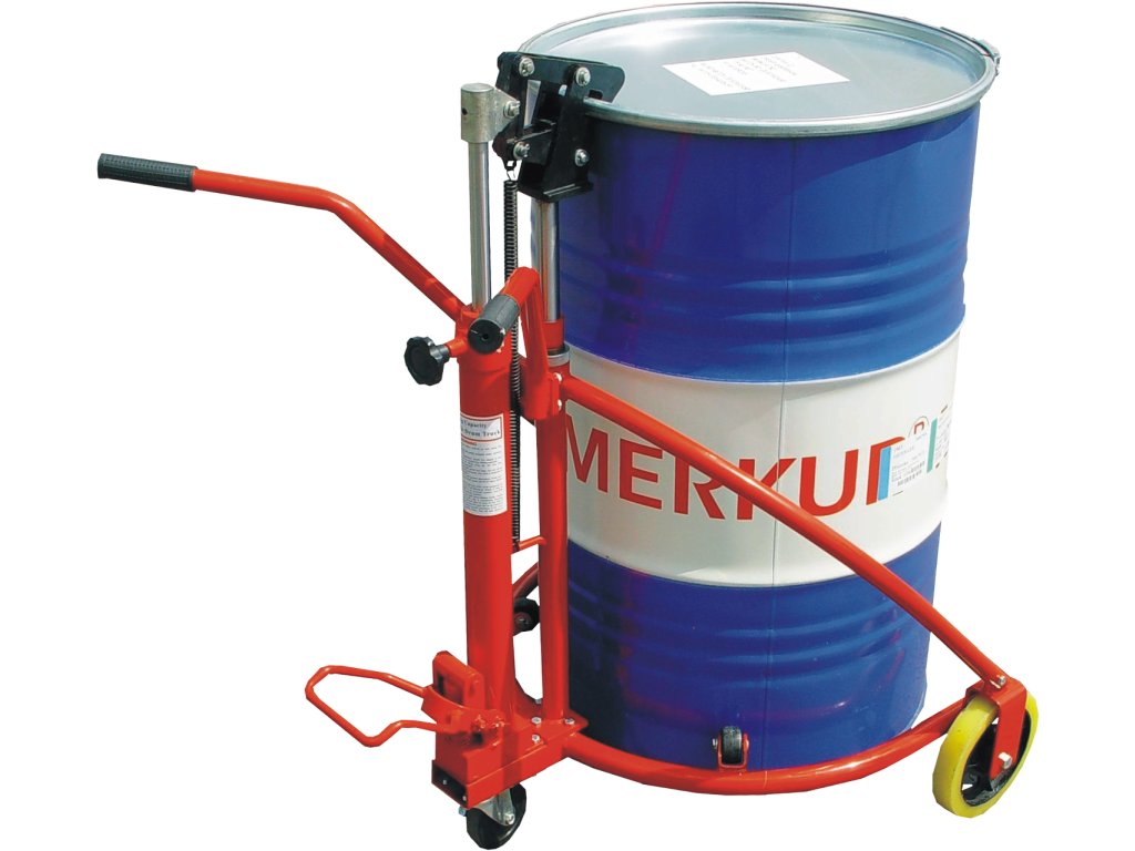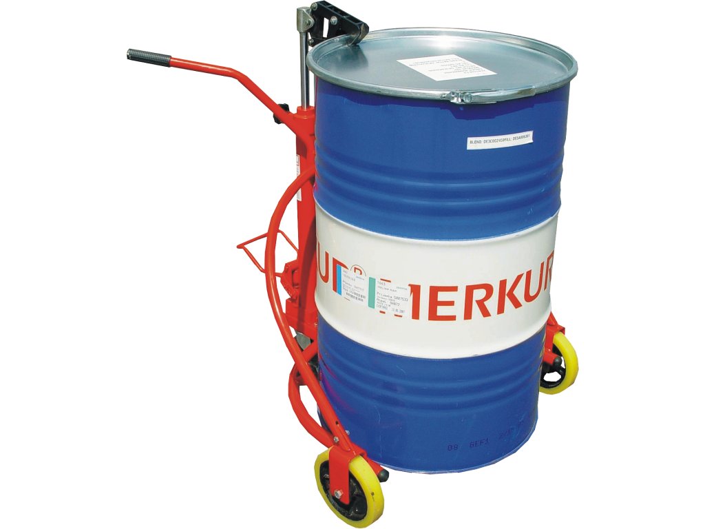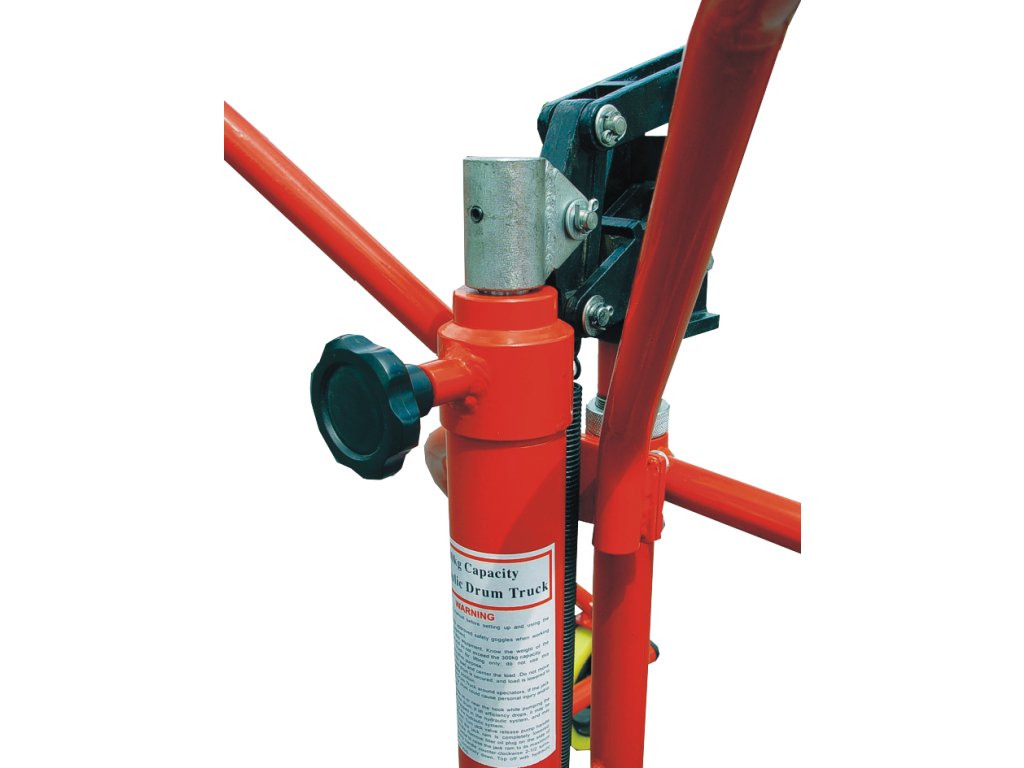 Tragfähigkeit max. 300 kg, Fassdurchmesser 400 – 600 mm, Fasshöhe 760 – 800 mm, Hub 100 mm (hydraulische Fußpumpe).