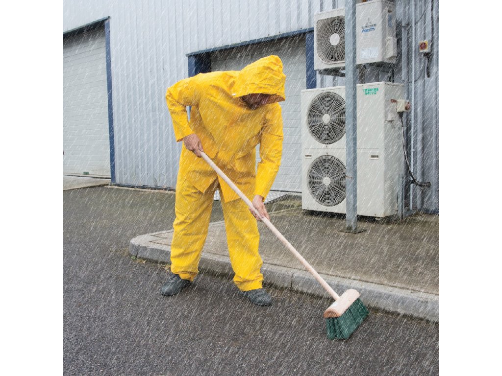 Strapazierfähiger, wasserdichter Regenmantelanzug aus PVC, mit Kapuze mit Kordelzug im Nacken, vorne mit Reißverschluss mit Überhängen, doppelten Jackentaschen, Belüftungslöchern in den Achselhöhlen und Belüftungslöchern hinten mit Klappe, gegen das Eindringen von Wasser. Elastische Hosen sind mit Druckknöpfen an den Knöcheln ausgestattet.