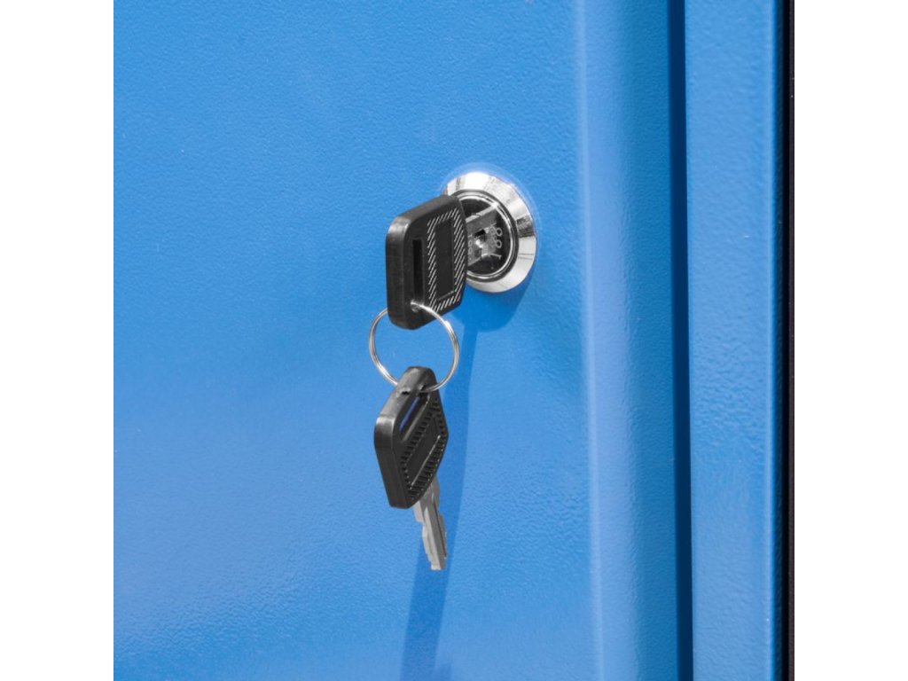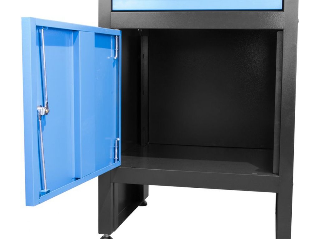 Konstruktion: Stahlrahmen, Sockel inkl. 4 Stellfüße (zum Ausgleich eventueller Bodenunebenheiten), Farbausführung: RAL 9005 (Korpus), RAL 5015 (Schublade, Tür).