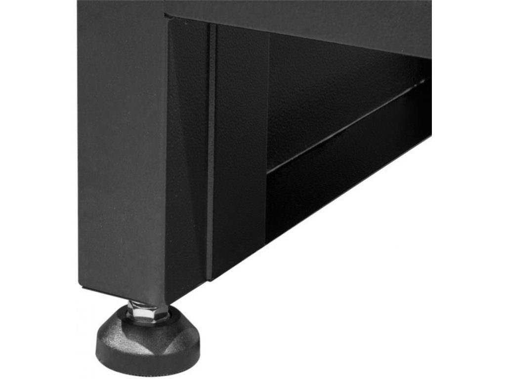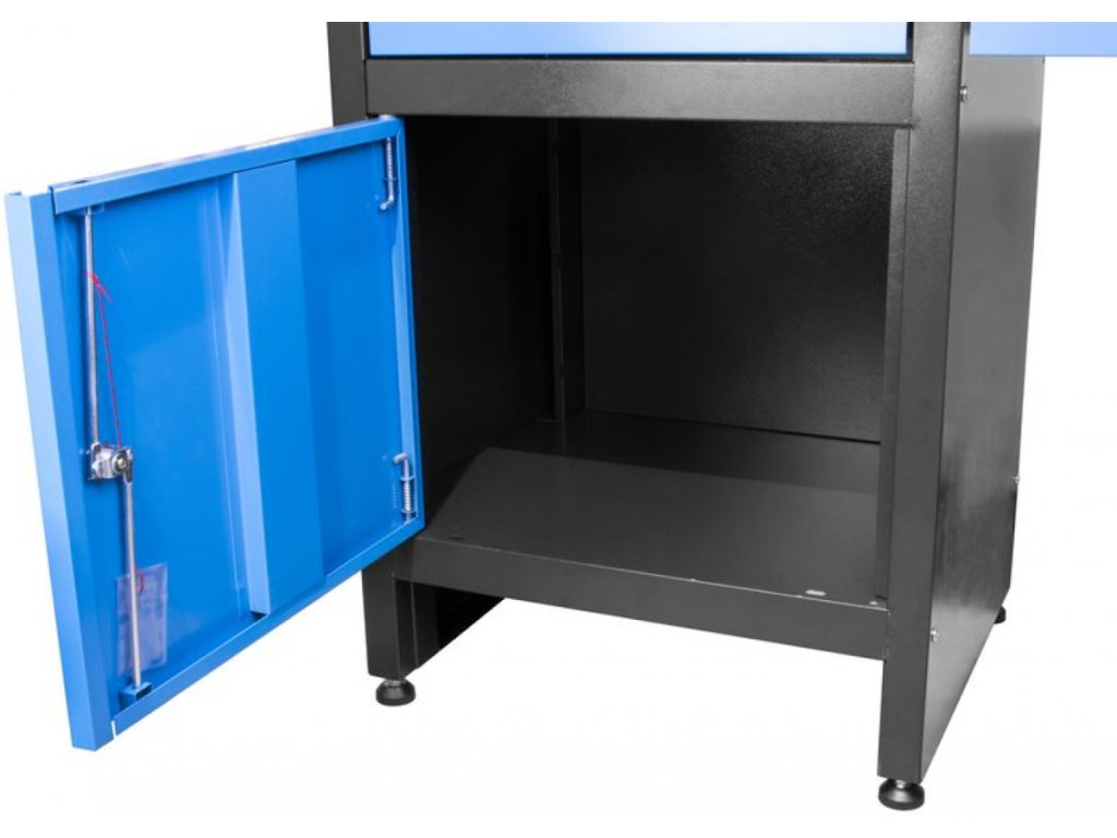 Konstruktion: Stahlrahmen, Sockel inkl. 8 Stellfüße (zum Ausgleich eventueller Bodenunebenheiten), Farbausführung: RAL 9005 (Korpus), RAL 5015 (Schubladen, Tür).