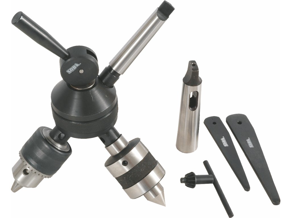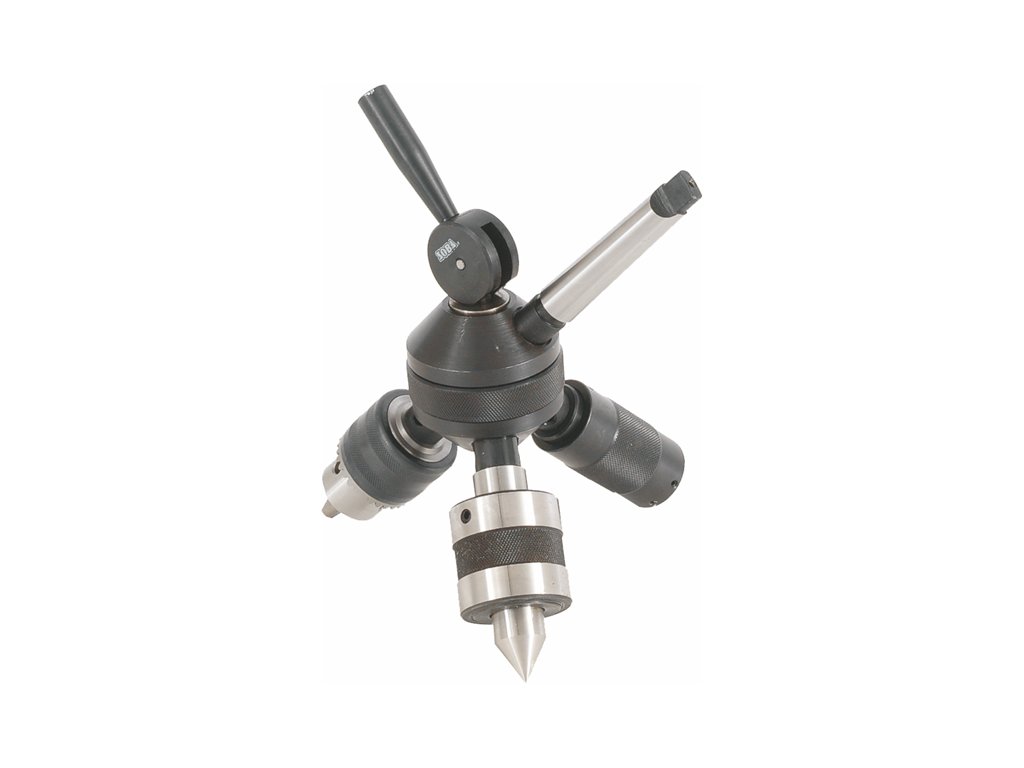 Der Kopf beinhaltet eine drehbare Zentrierspitze, ein Spannfutter und eine Buchse zum Spannen von 20 mm und 25 mm Gewindeösen. Der Werkzeugkopf ist drehbar mit einer exzentrischen Arretierung zur schnellen Änderung der Funktion. Der Kopf wird mit einer MK 3/2 Reduktion, einem Knebel für Spannfutter und einem Treibkeil geliefert.