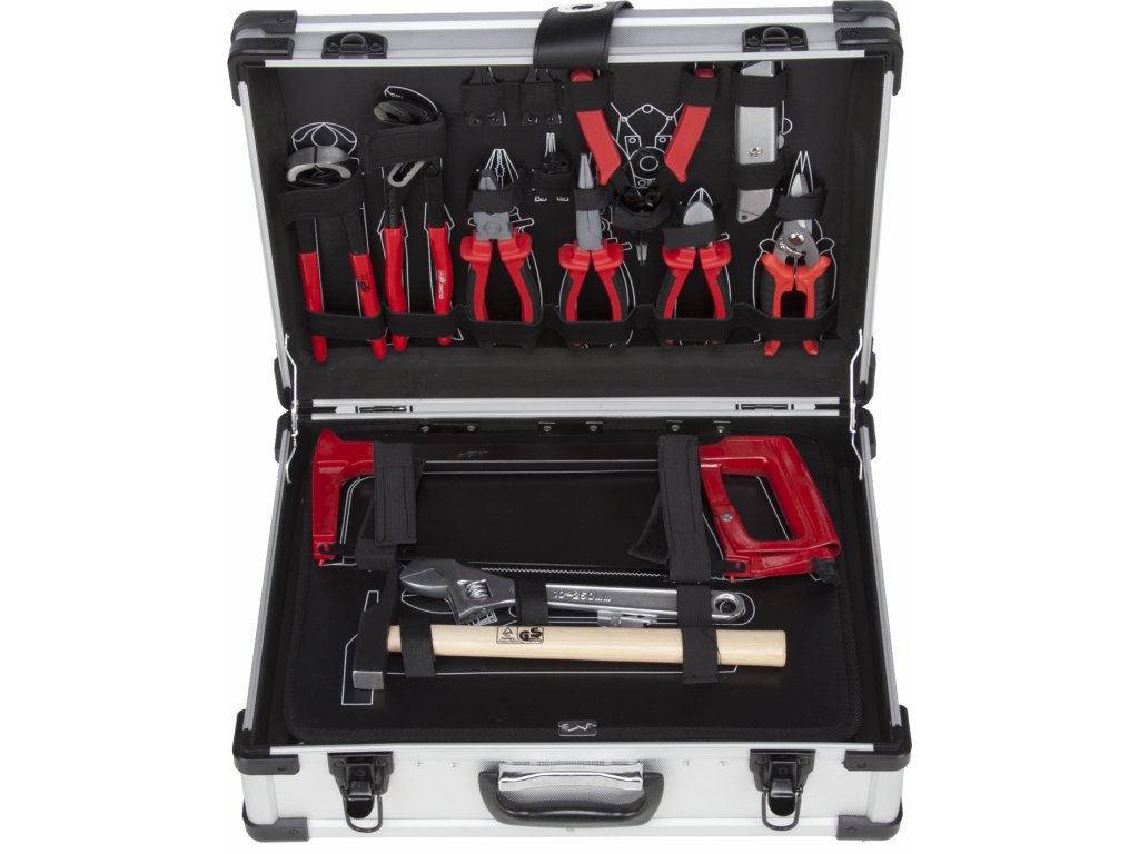 Werkzeugsatz im ALU-Koffer mit übersichtlichen Fächern beinhaltet 1 enge Zange, 1 Seitenschneidzange, 1 Kombizange, 1 Schere, 1 Sicherungsringzange mit wechselbaren Backen, 1 Sika-Zange, 1 Vorschneider, 1 Messer, 1 Rollgabelschlüssel, 1 Bügelsäge, 1 Hammer, 5 Austreiber und Meißel, 6 Schraubendreher, 1 Prüfer 12 V, 4 feine Schraubendreher, 31 Bits, 1 Leuchte, 13 1/2"-Steckschlüssel + Knarre, 13 1/4"-Steckschlüssel + Knarre, 2 1/2"-Verlängerungsaufsätze, 2 1/4"-Verlängerungsaufsätze, 2 Gelenkaufsätze, 2 Kerzenschlüssel, 1 St. „T″, 1 Verbinder, 1 Adapter, 1 Schublehre, 1 teleskopischer Aufsatz mit Magnet, 9 Inbusschlüssel, 9 Ringflachschlüssel. Koffermaße 48 × 36 × 18 cm.