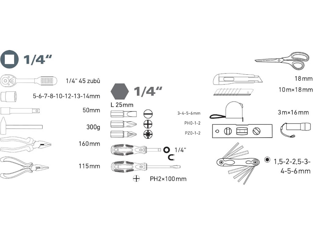 - andere Teile: Wasserwaage 170 mm, LED-Taschenlampe 60 lm, Büroschere 190 mm - Verlängerung: 1/4" × 50 mm (CrV)