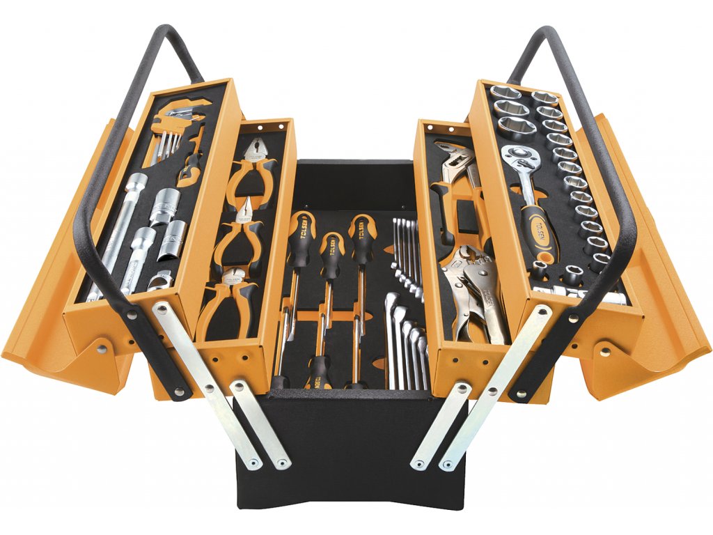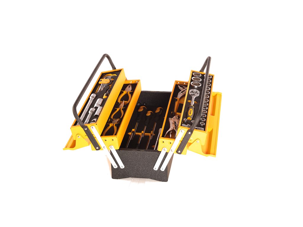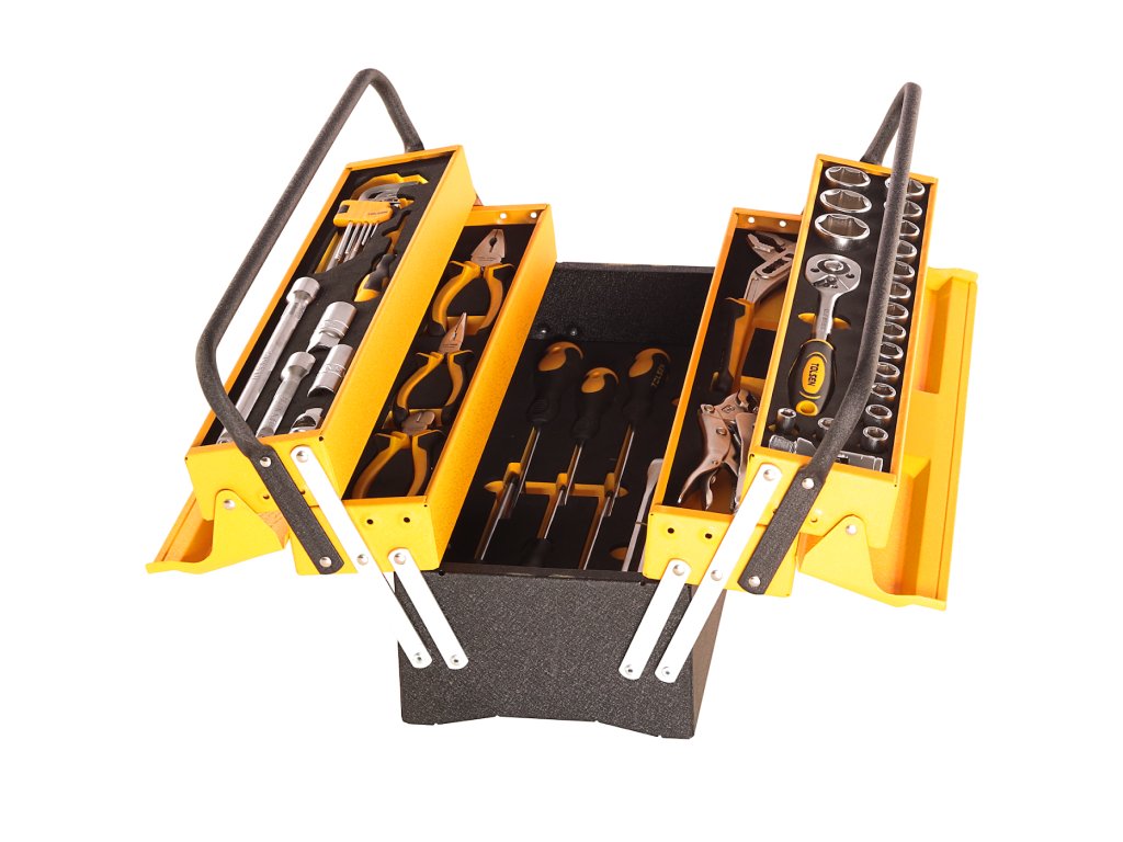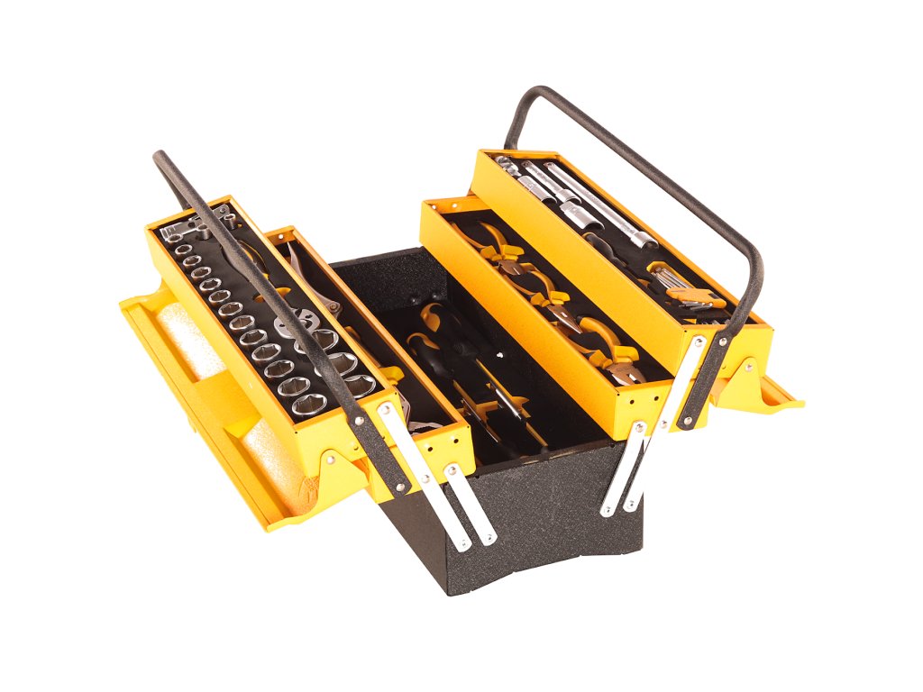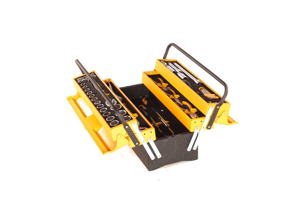 Das Set ist in einer Box aufbewahrt, Abmessungen 540 × 300 × 210 mm. Im Set enthalten: Einstellbare Pumpenzange 250 mm; selbstsichernde Zange 250 mm; Kombizange 180 mm; lange, schmale Zange 160 mm; Kneifzange, seitlich 160 mm; Steckschlüssel 1/2" 8; 10; 11; 12; 13; 14; 15; 16; 17; 18; 19; 20; 21; 22; 24; 27; 30 und 32 mm; Ringmaulkombischlüssel 8; 10; 11; 12; 13; 14; 15; 16; 17; 18; 19; 22 und 24 mm; Schraubendreher SL3 × 75 mm; SL5,5 × 100 mm; SL6,5 × 150 mm; SL8 × 150 mm; PH1 × 100 mm; PH2 × 150 mm und PH3 × 150 mm; Verlängerungsaufsätze 1/2" 250 und 125 mm; 1/2"-Gelenkaufsatz, 3/8"-Dreifachaufsatz auf 1/2"; Ratsche 1/2", 45 Zähne; Zündkerzenschlüssel 1/2" 16 und 21 mm und Sechskantschlüsselsatz mit Kugel 1,5 2; 2,5; 3; 4; 5; 6; 8 und 10 mm. Die Box kann mit einem Vorhängeschloss verschlossen werden.