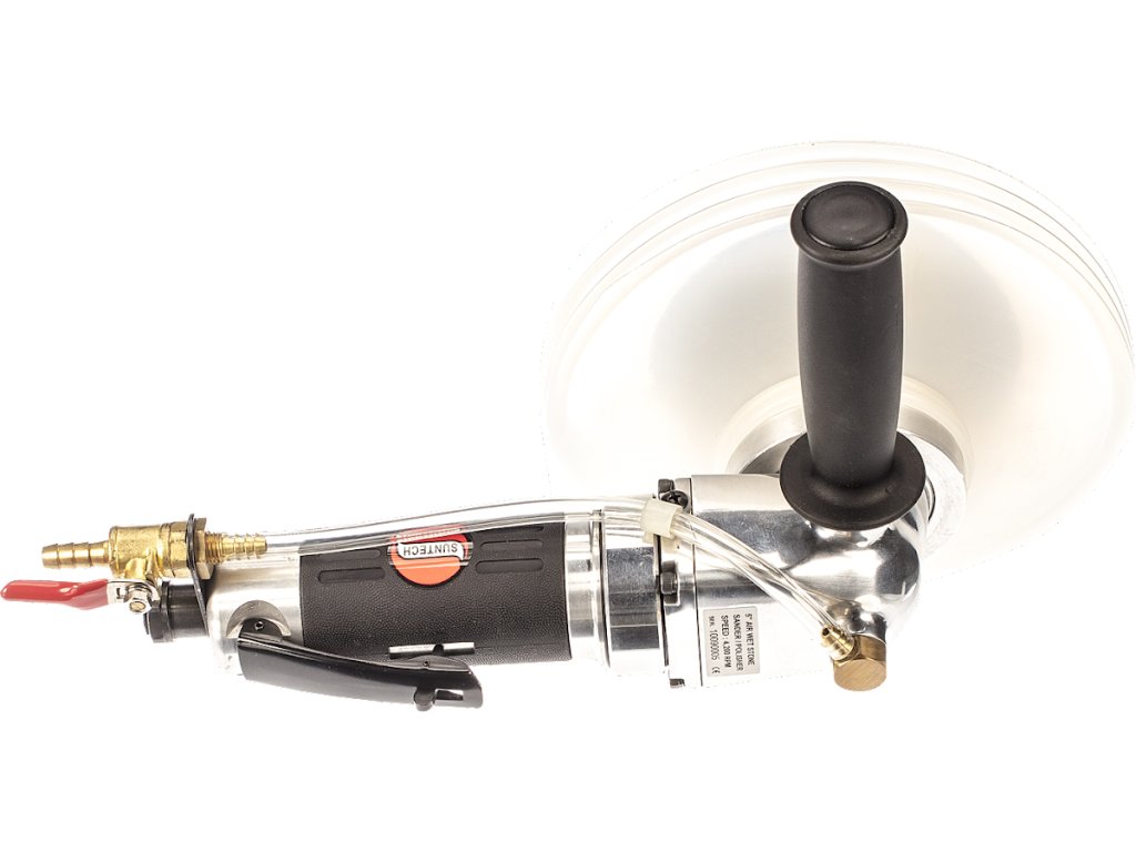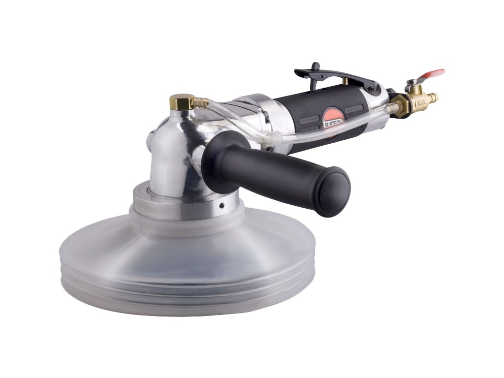 Mit einem Spritzschutz für das in den Arbeitsbereich zugeführte Kühlwasser. Leerlaufdrehzahl 4.200/min., Scheibe ø 125 mm, Spindelgewinde M14 × 2, Luftzuführung 1/4", Arbeitsdruck 6,2 bar, Länge 282 mm.